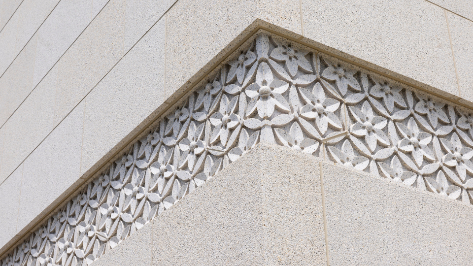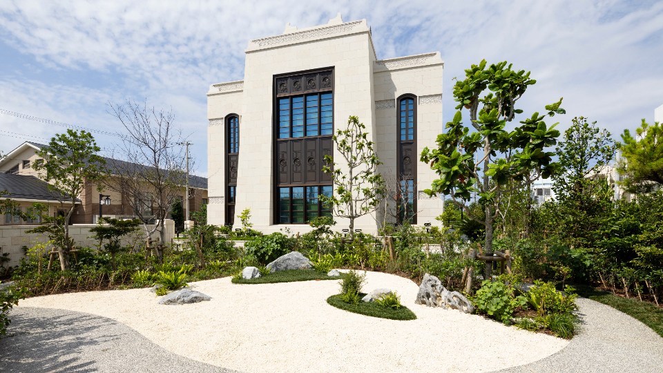 The temple exterior derives from traditional Okinawan architecture. The arches over the windows are inspired by portals in traditional stone walls, like those at the Shurijo Castle, Nakagusuku Castle and Sogenji Temple.