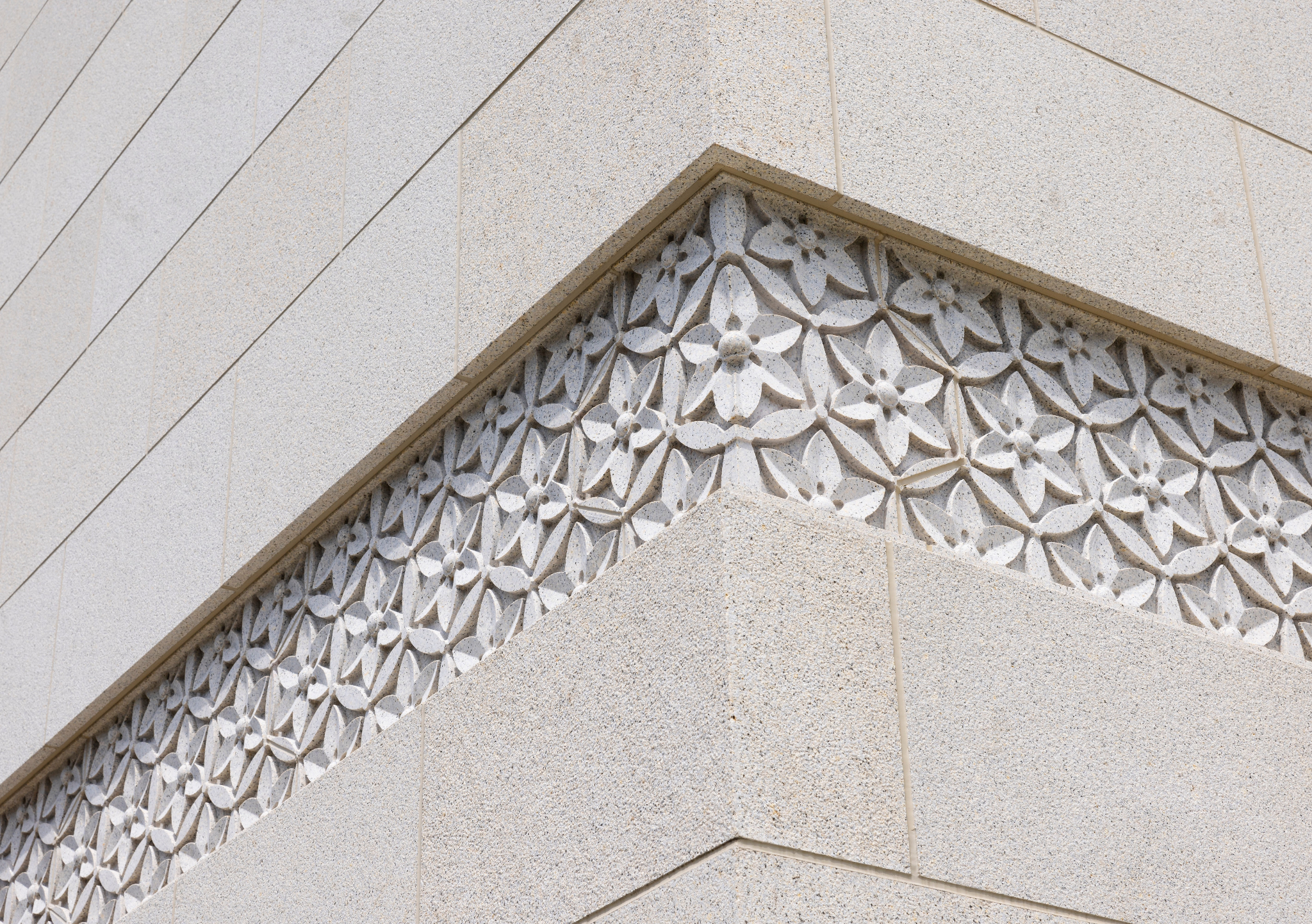 The decorative floral band that connects the arches alludes to the traditional karamon gate. The structure consists of reinforced concrete with a granite exterior.
