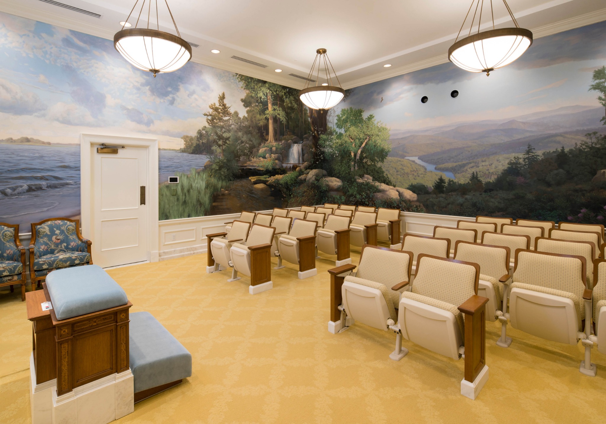 The temple sits nestled among a local forest and evergreen trees in the suburban Wake County community of Apex, roughly 15 miles southwest of the historic colonial city of Raleigh. Adjustments to some of the larger exterior features were made during the remodel: the portico was enclosed, and the tower’s steeple now stands 10 feet taller.