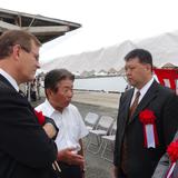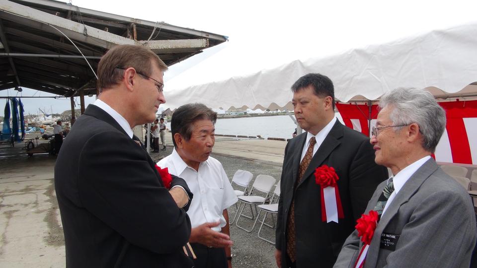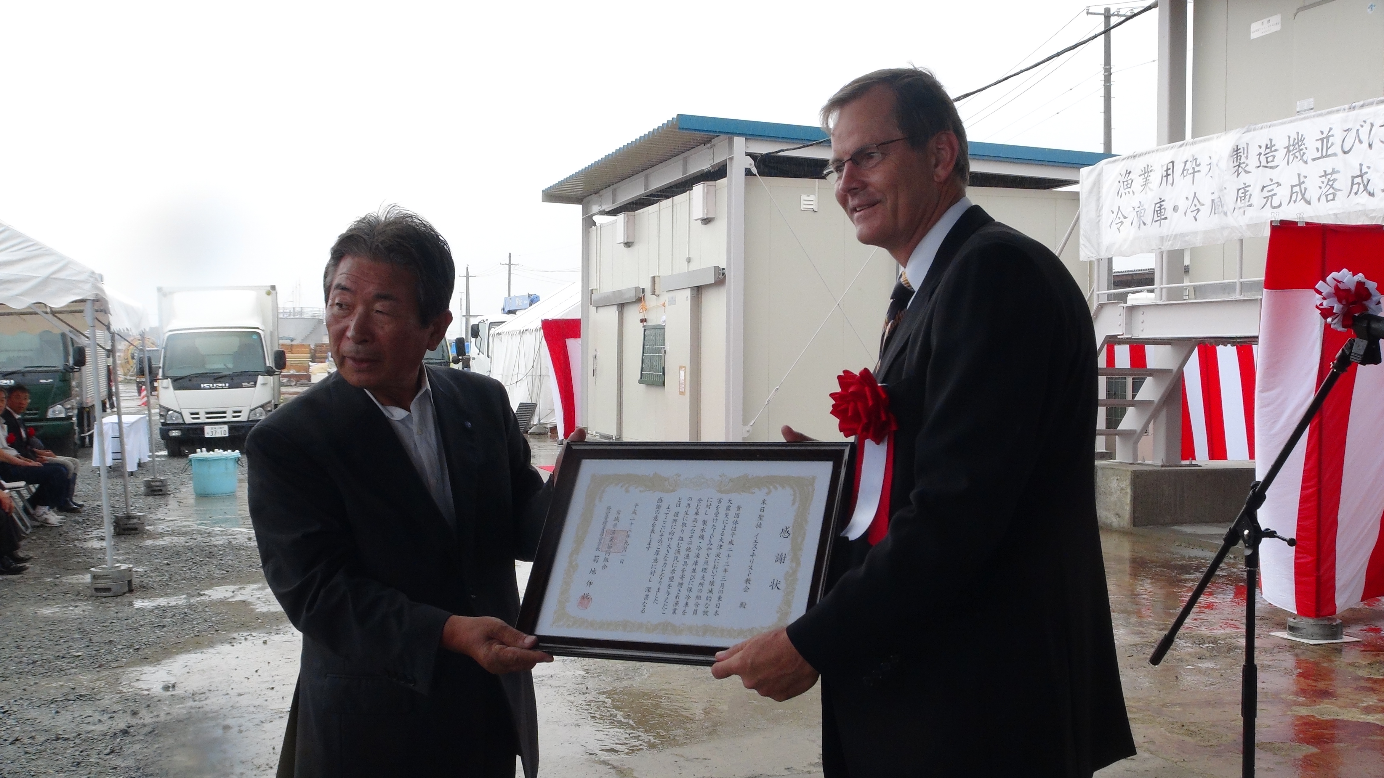 A ribbon cutting ceremony for the new ice machine was held 1 September. The 11 March tsunami destroyed all but one of 84 fishing boats in a local fishing cooperative. Although some boats were repaired, the fishermen were beached without ice to preserve the daily catch.