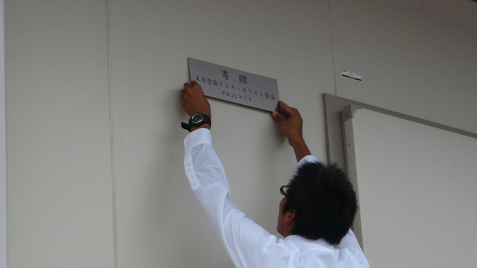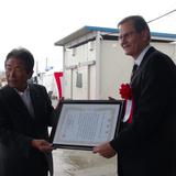 The ice machine is capable of making 3.3 tons of ice a day. Prefectural Fishing Cooperative President Shinetsu Kikuchi called the gift “a large step for people in the fishing industry” as he presented a plaque of appreciation to the Church.