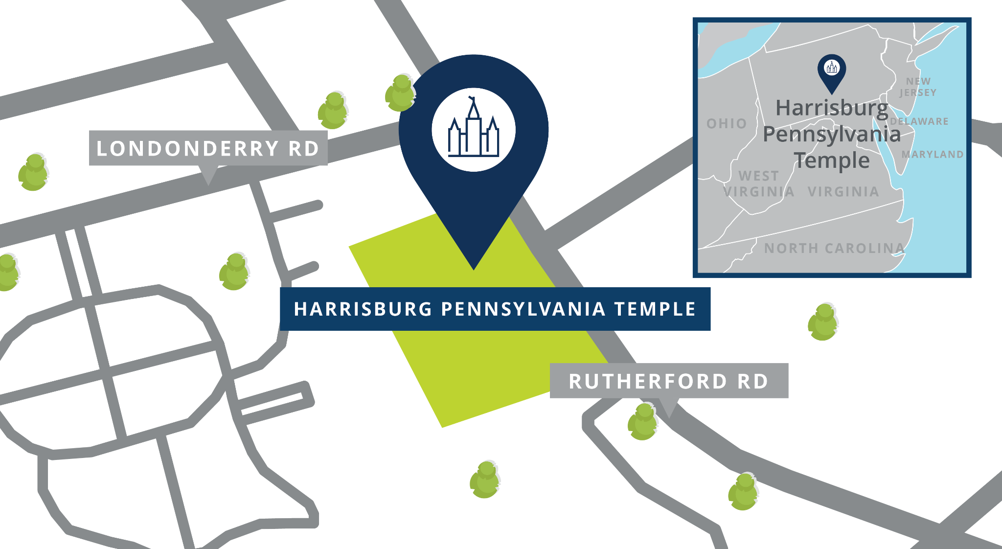 This temple will be built on a 5.36-acre site located at 605 Rutherford Road, Harrisburg, Dauphin County, Pennsylvania 17109. Plans call for a single-story temple of approximately 20,000 square feet.