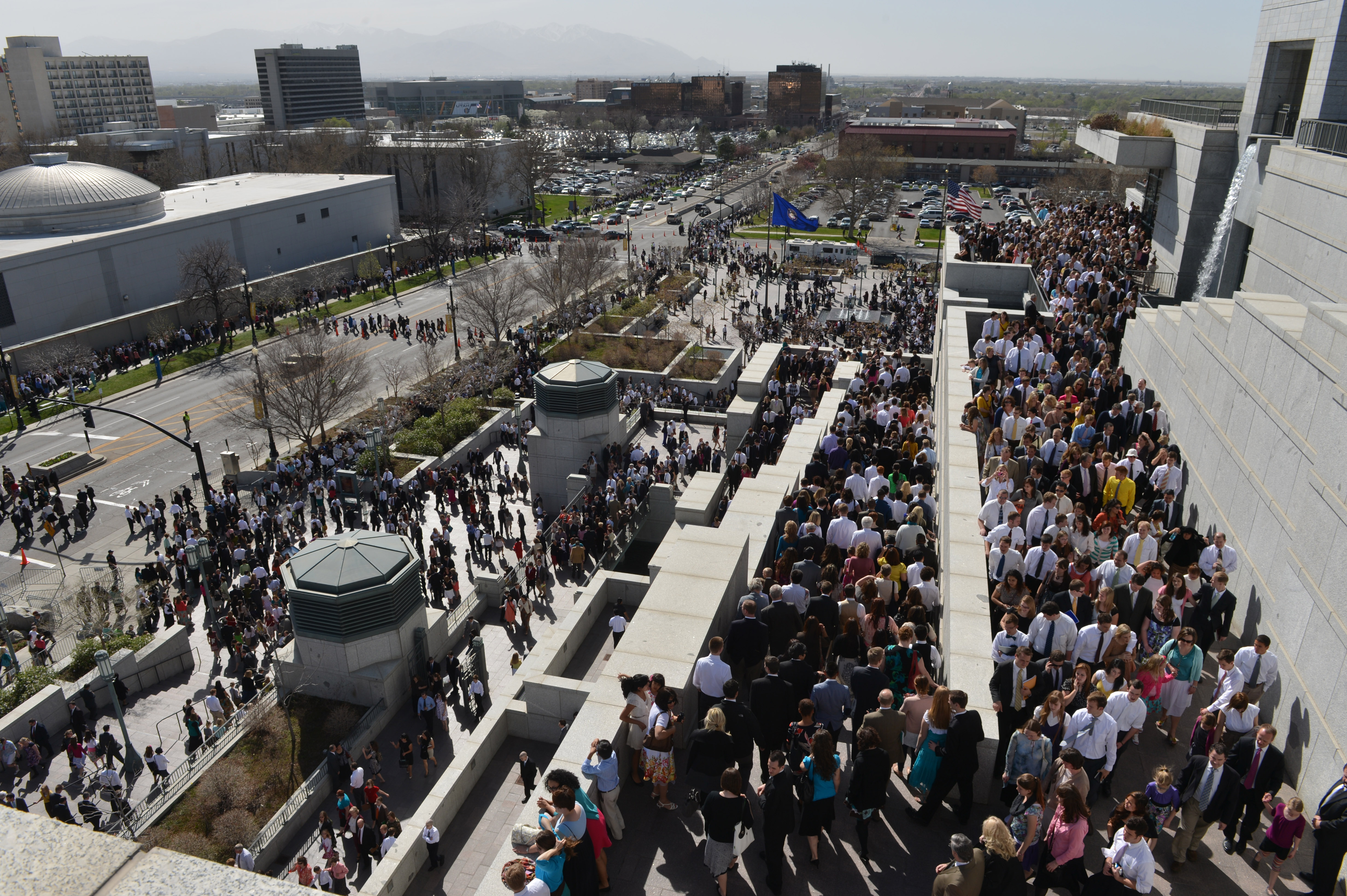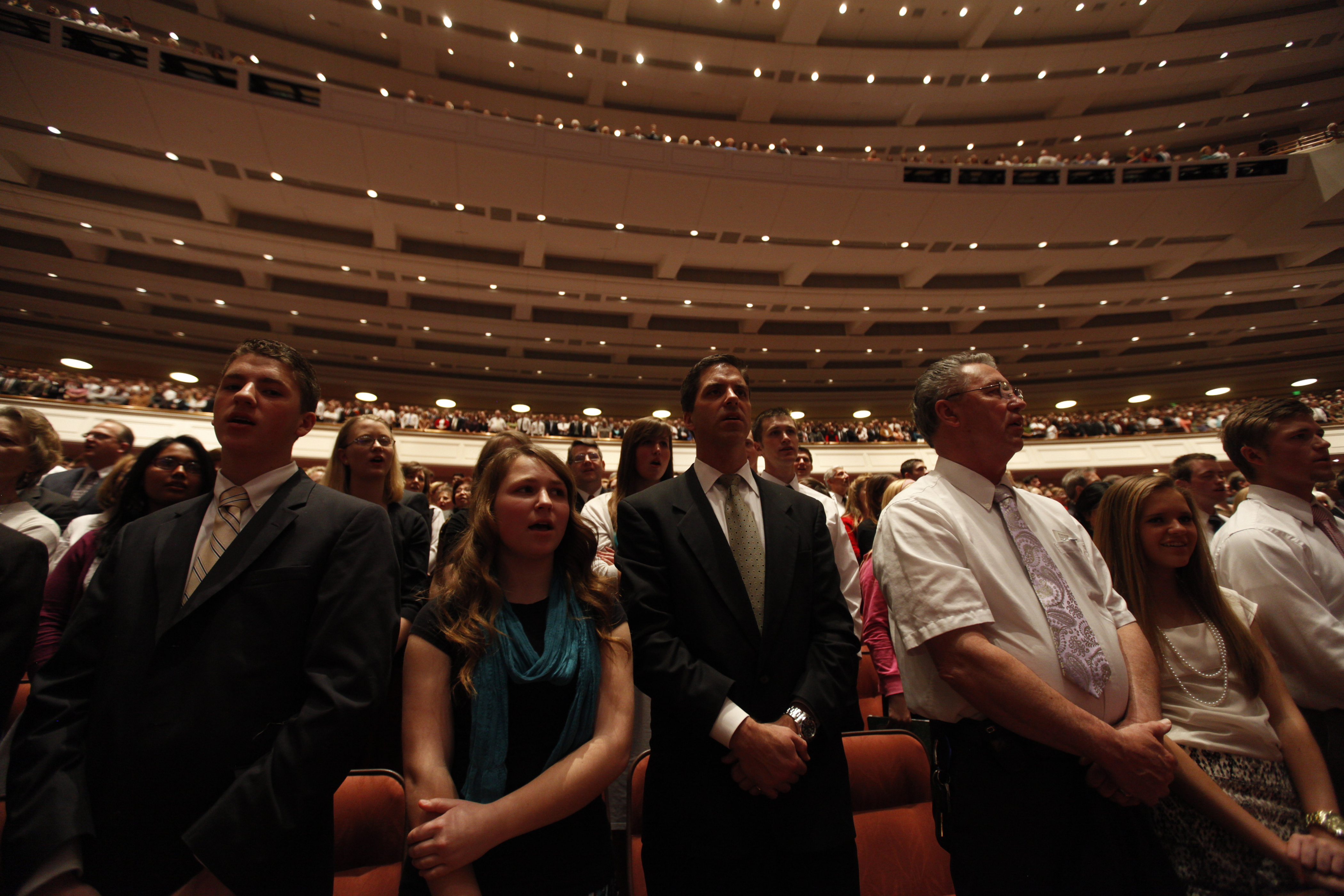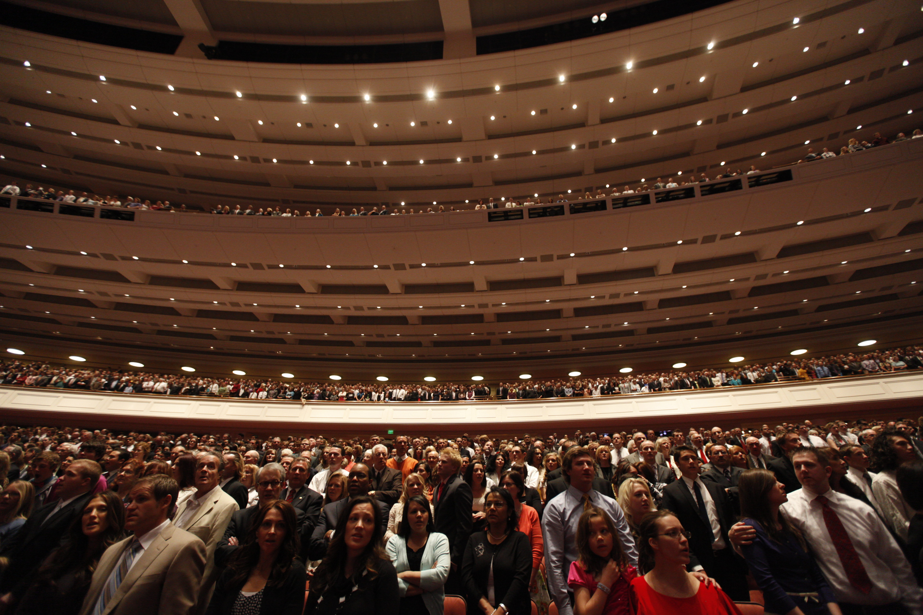 General conferences of The Church of Jesus Christ of Latter-day Saints take place every six months, originating in the 21,000-seat Conference Center in Salt Lake City and reaching a global audience estimated to be in the millions. The proceedings are available in 94 languages via television, radio, satellite and Internet broadcasts. Five sessions of the conference will be held Saturday and Sunday, 31 March-1 April 2012, in the Conference Center in Salt Lake City, Utah.