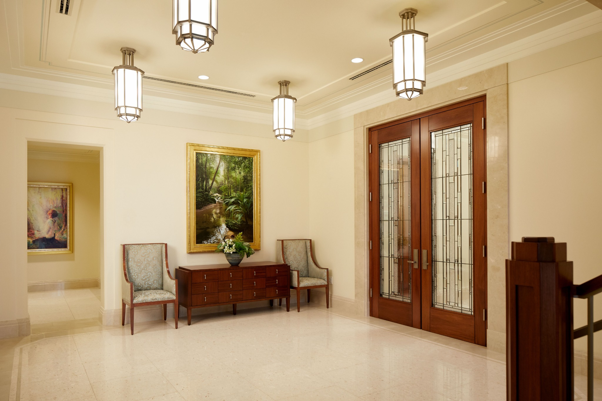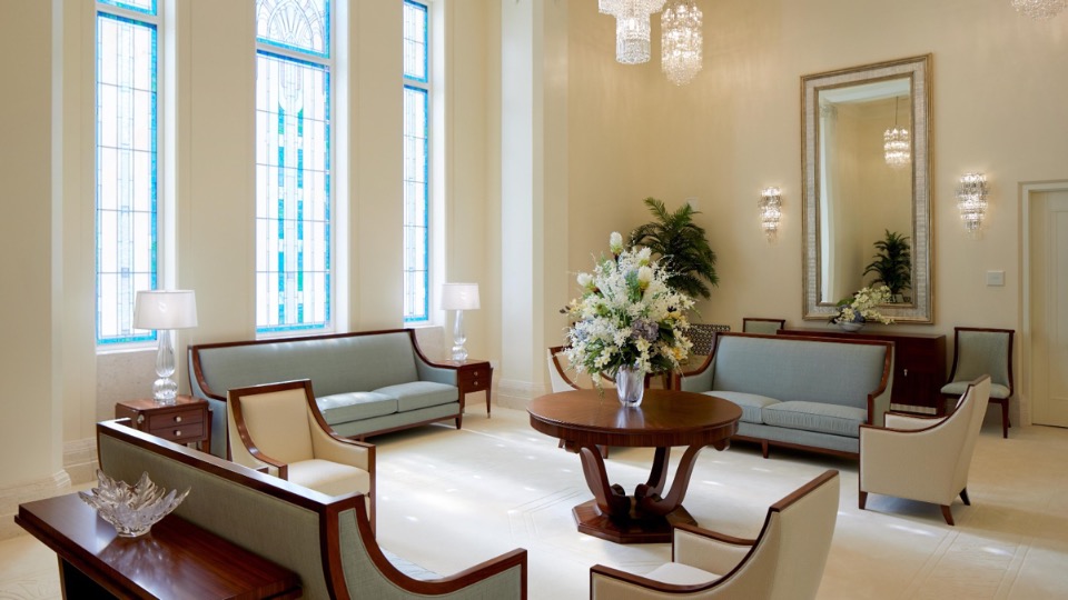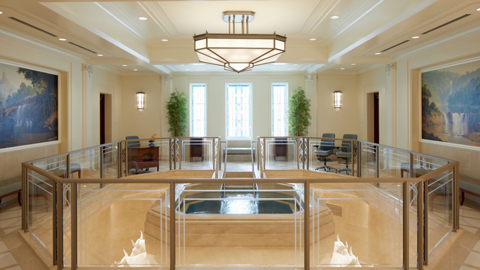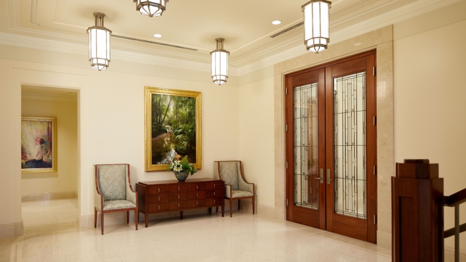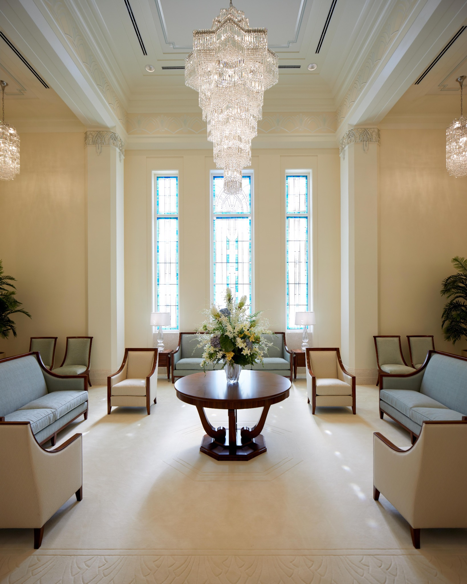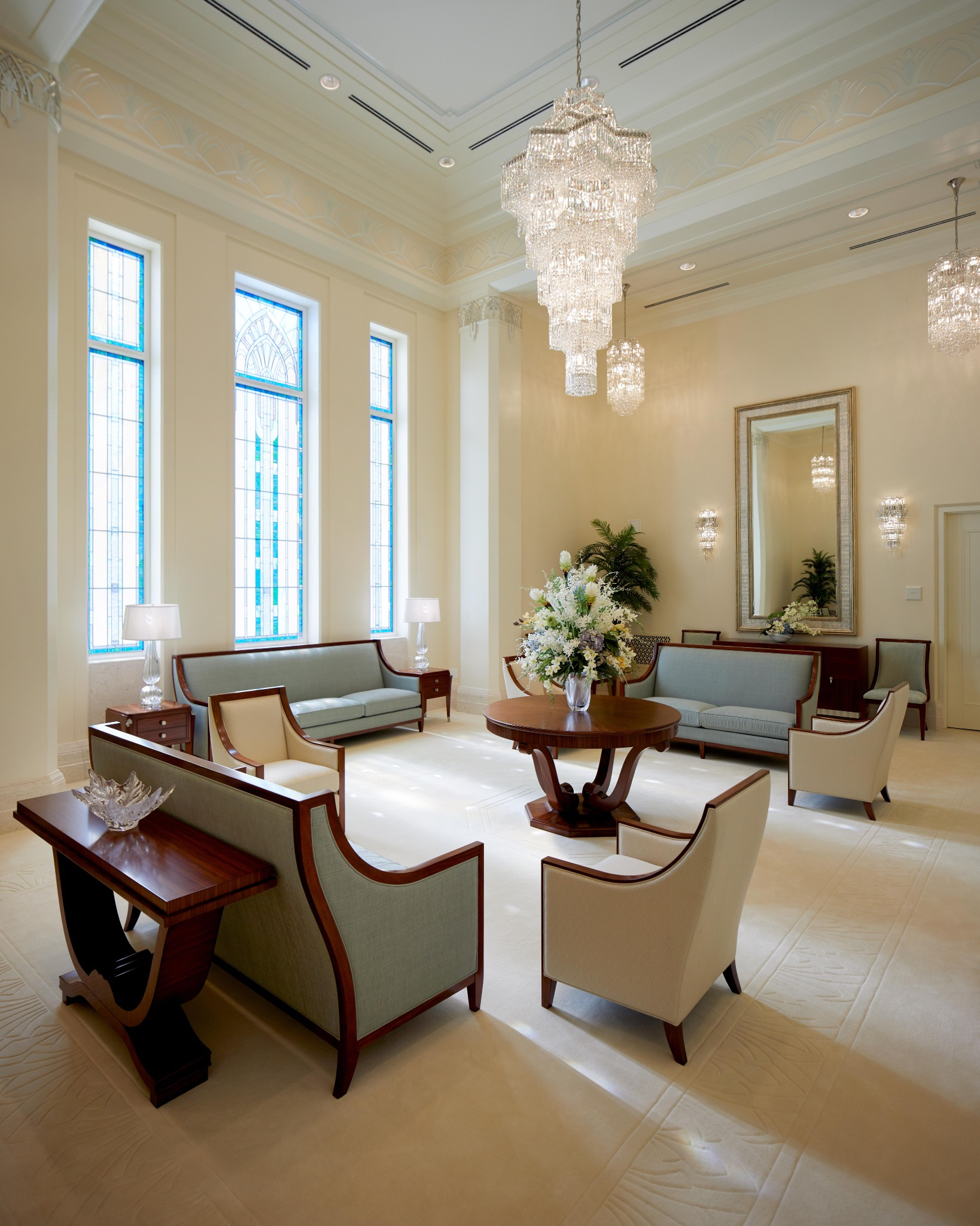 Design elements are finished with clean lines that evoke and reinforce a planar feel. Inside the temple, chandeliers, stylized railings, expertly crafted millwork and exquisite art glass invoke an art deco feel.