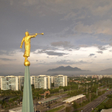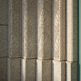 The strong, simple, symmetrical design of the exterior focuses on the entablature and window surroundings composed of carved stone representing the Art Deco arches motif. A beautiful single spire rises over 140 feet and is topped by a gilded statue of the ancient prophet Moroni.