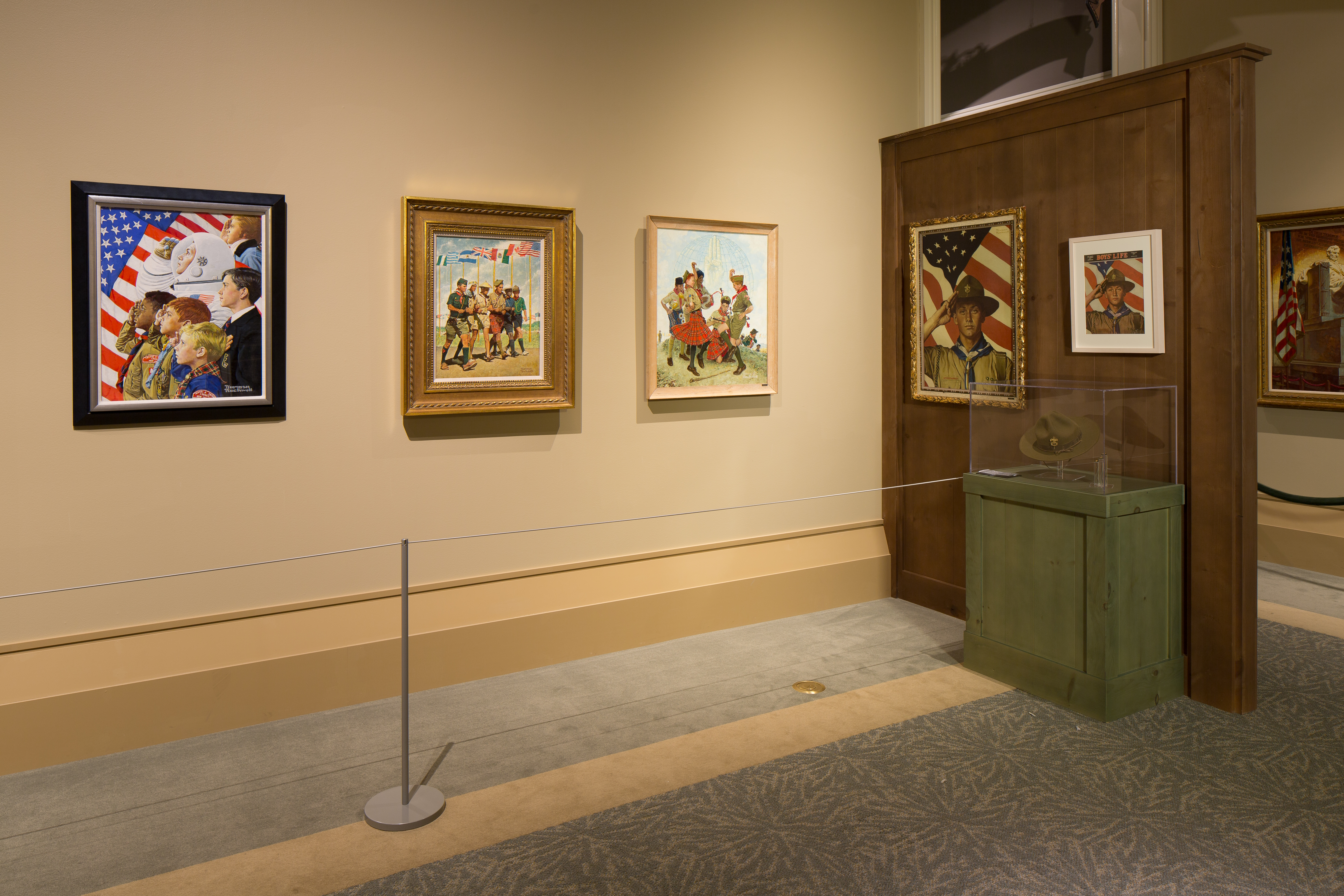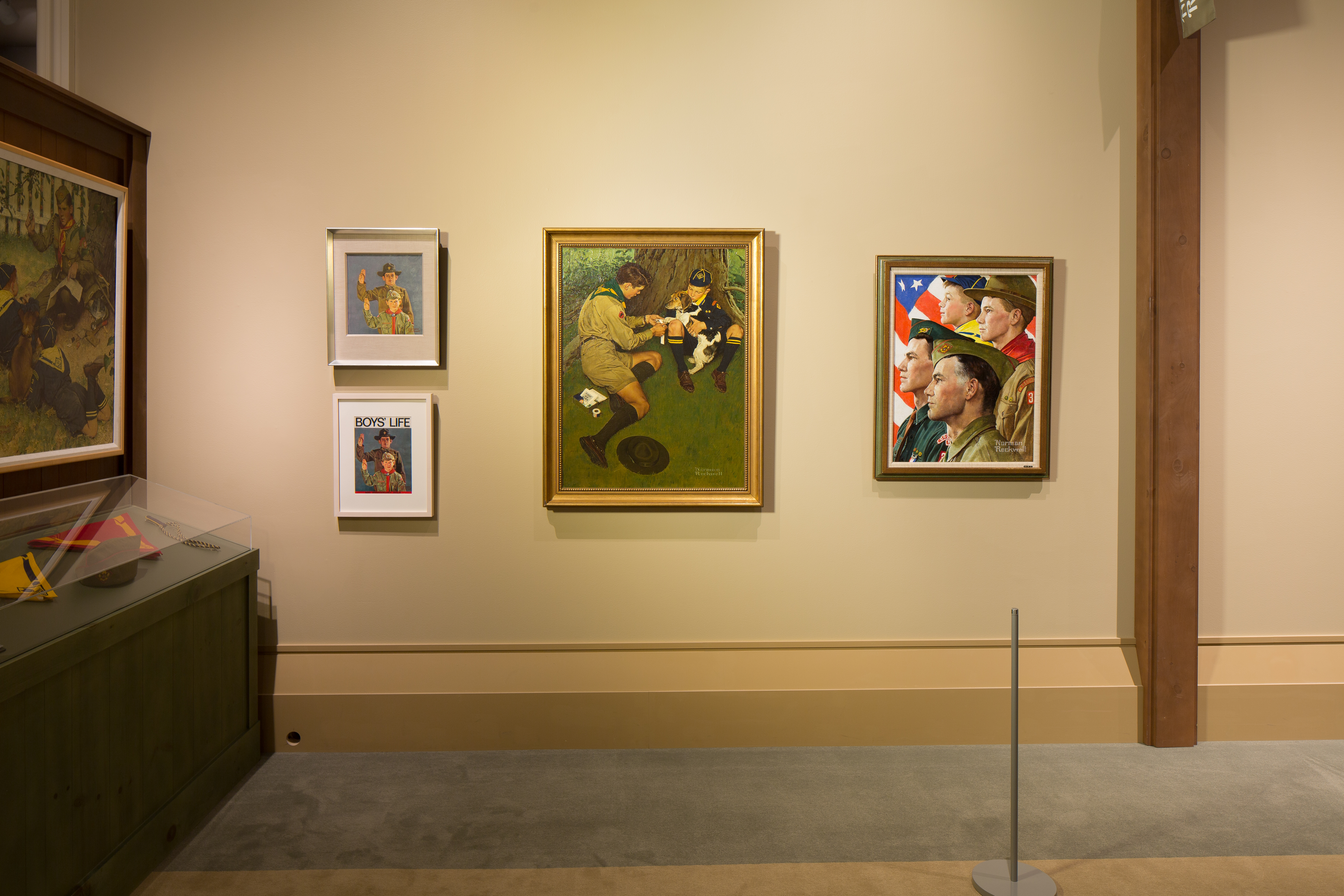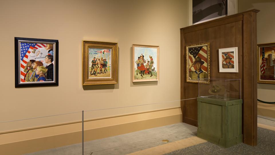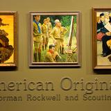 Both exhibits include historical Scouting uniform pieces and other objects. The Rockwell exhibit displays some of the same items that appear in the paintings.