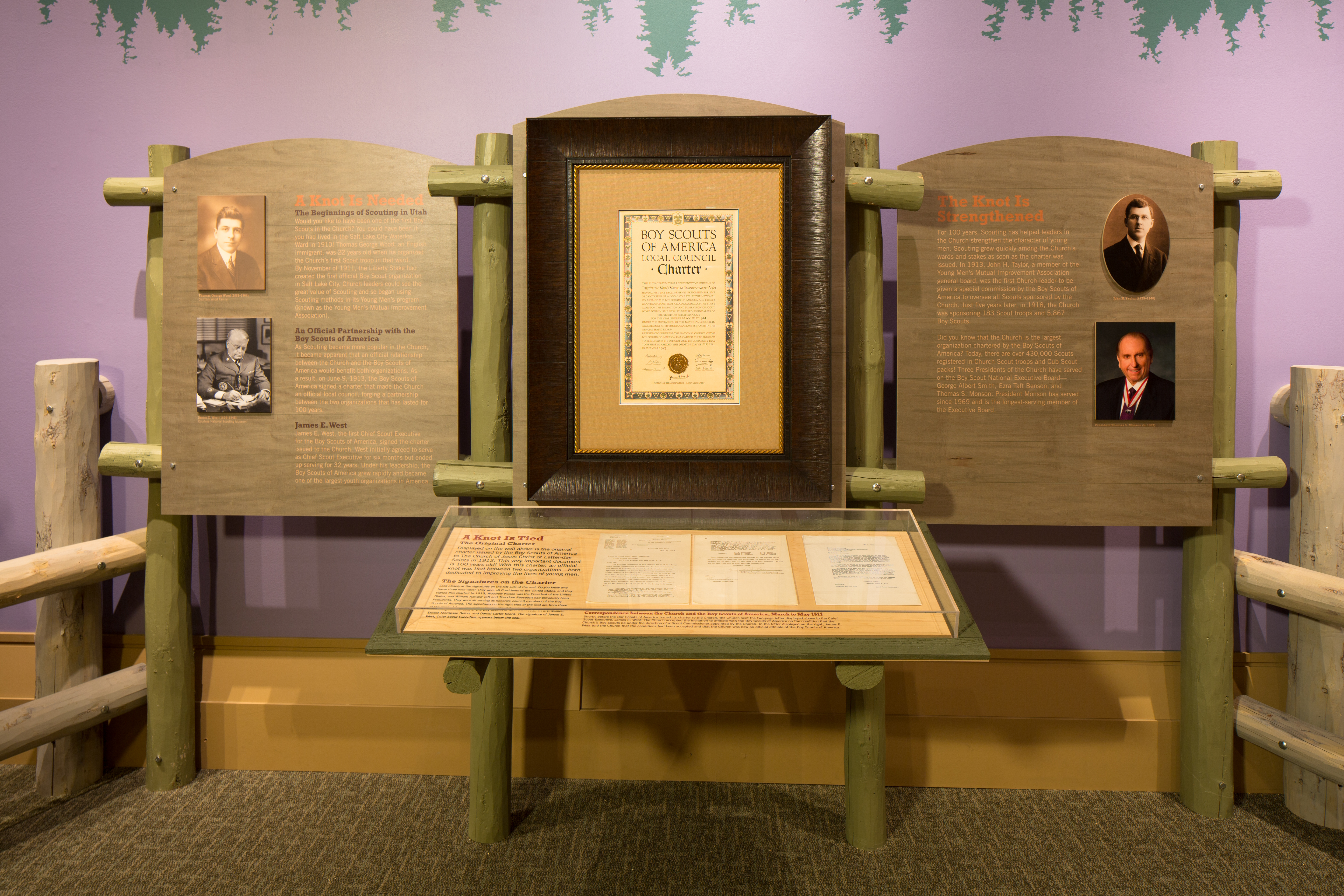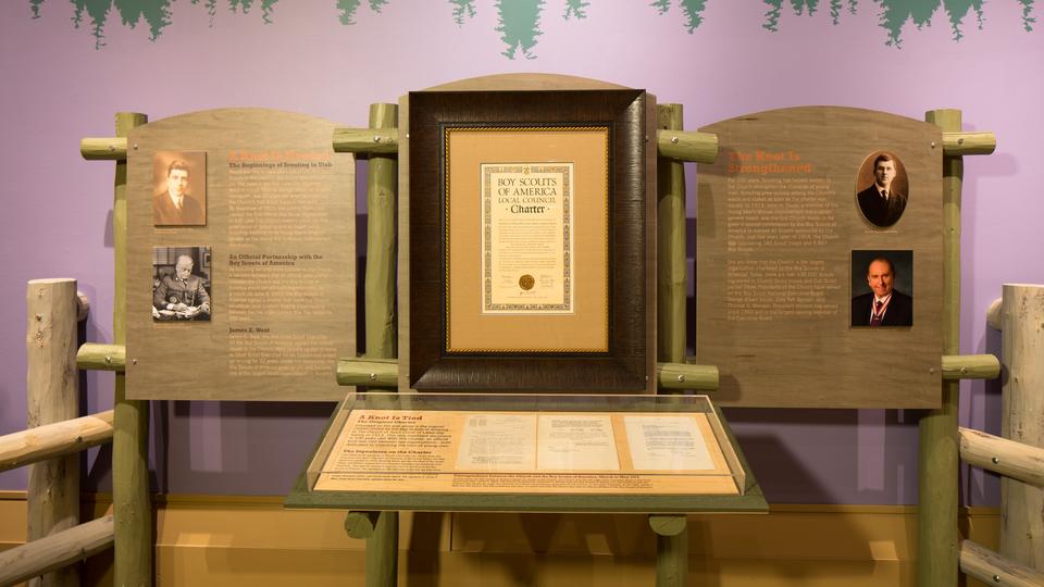Included in the exhibit is the official charter outlining the partnership between BSA and the Church, signed on 9 June 1913. The first known Boy Scout troop in Utah was formed in 1910 at the request of 22-year-old Thomas G. Wood, an English emigrant, for the boys in his Salt Lake City congregation. Over the next few years, Scouting became popular among Church members, and it became apparent that an official relationship between the Church and BSA would benefit both organizations. The details of the relationship were discussed by officials from both organizations, and an agreement to affiliate was reached in May 1913.