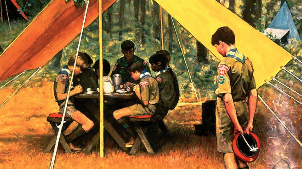 Several pieces focus on duty to God and country, part of the Scout Oath. In “We Thank Thee, O’ Lord,” Rockwell depicts a group of Scouts saying grace at a camp dinner table, heads bowed. In 1963, Rockwell remarked that his most popular Boy Scout calendar illustrations were “the three or four with a religious flavor.”