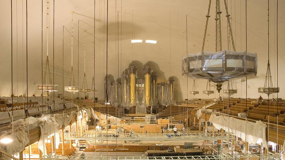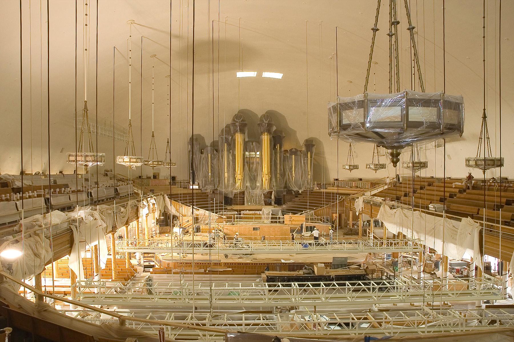 Additionally, new stairways were installed, the ceiling was re-patched and many pews that were in disrepair were replaced. New plumbing and electrical systems were installed throughout the building, as well as new lighting and audio equipment. Organ pipes received new gold leafing, and a special orchestra staging area was added along with new choir offices and a new music library.