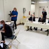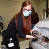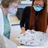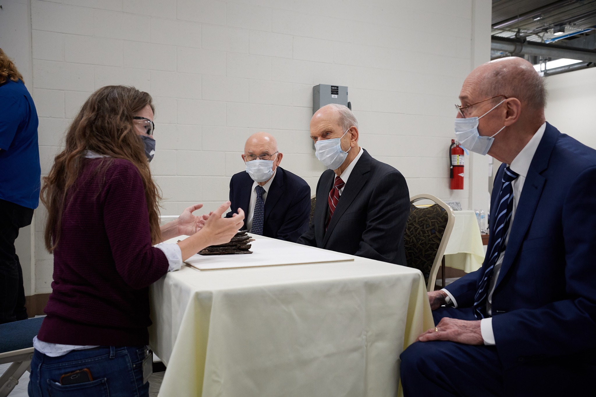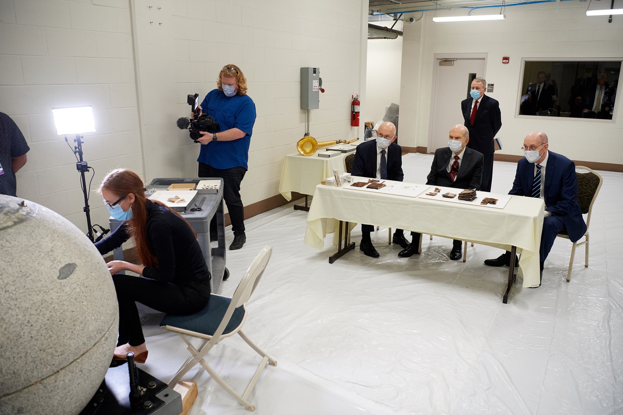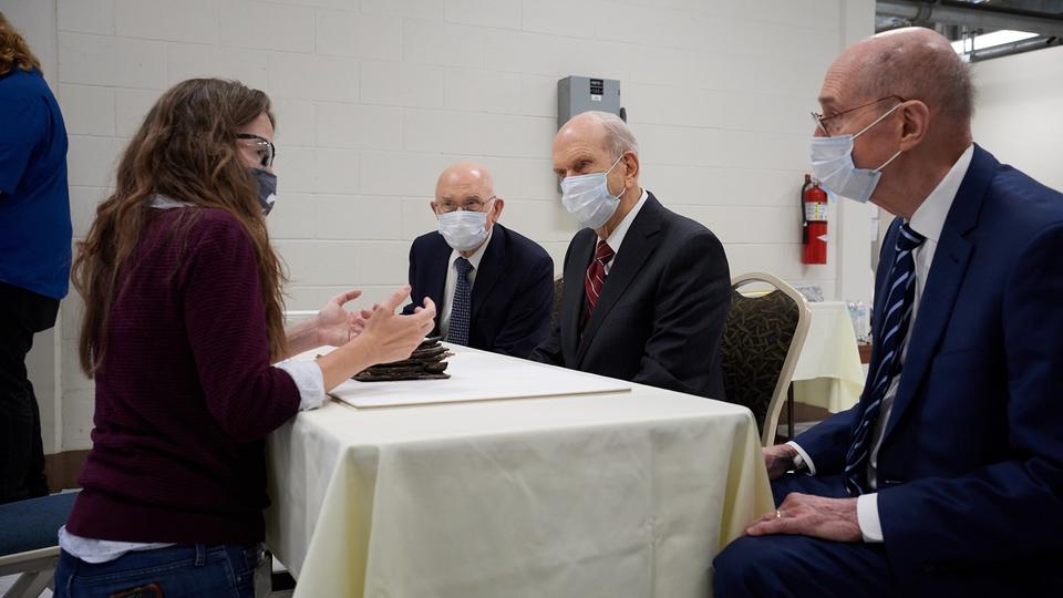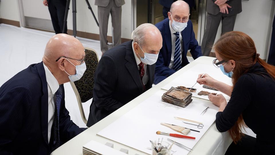 Emiline Twitchell, a conservator at the Church History Library, shows contents from the capstone of the Salt Lake Temple to the First Presidency on May 20, 2020.2020 by Intellectual Reserve, Inc. All rights reserved.The Time Capsule Contents and Their Condition
