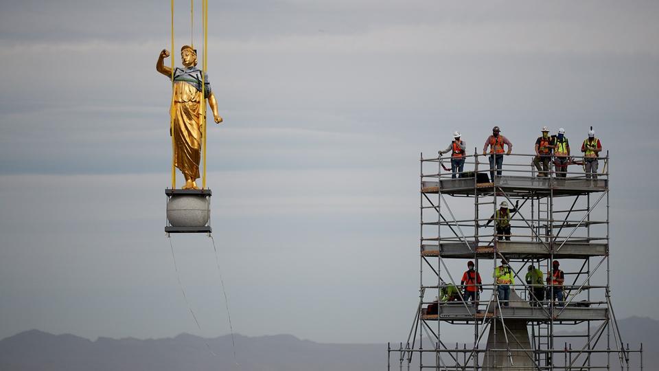 Fast-forward 128 years to May 18, 2020, a day perhaps equal in balminess but not in fanfare. No large crowds were present. A few dozen construction workers removed that same 3,800-pound circular granite capstone, along with its time capsule contents and the angel Moroni statue that has stood on top of it. This was done for preservation and refurbishing during the temple’s seismic upgrade that began in January 2020.