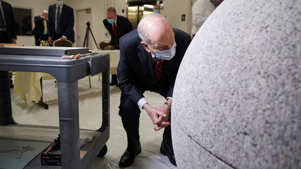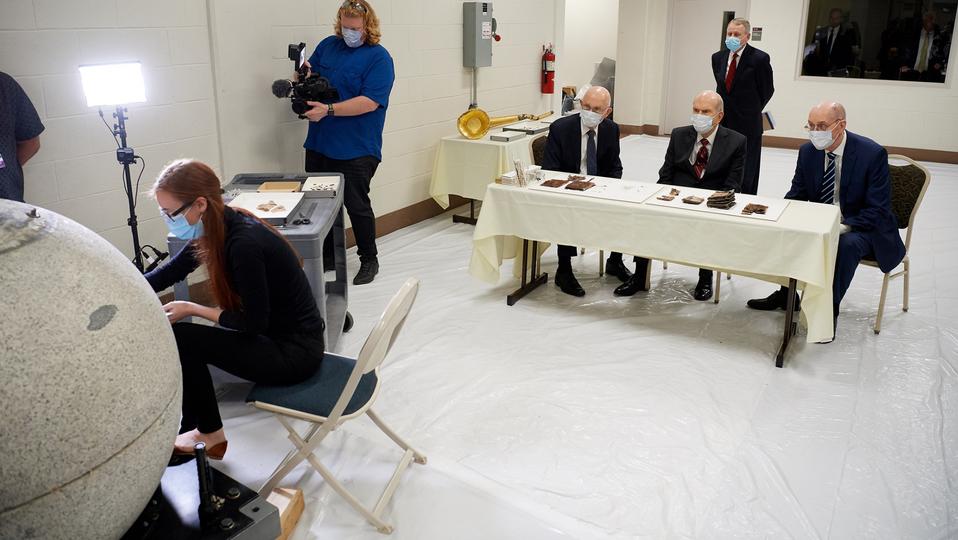 Indeed, two days after the capstone’s removal from the temple, the First Presidency joined a small group in the loading dock of the Church History Library to witness the initial opening of the time capsule. Since that time, conservation experts and stone masons have carefully cut through the capstone’s thick granite and cement — as Utt said, with small chisels — to retrieve the remainder of the treasures that have sat in several cavities within for nearly 13 decades.