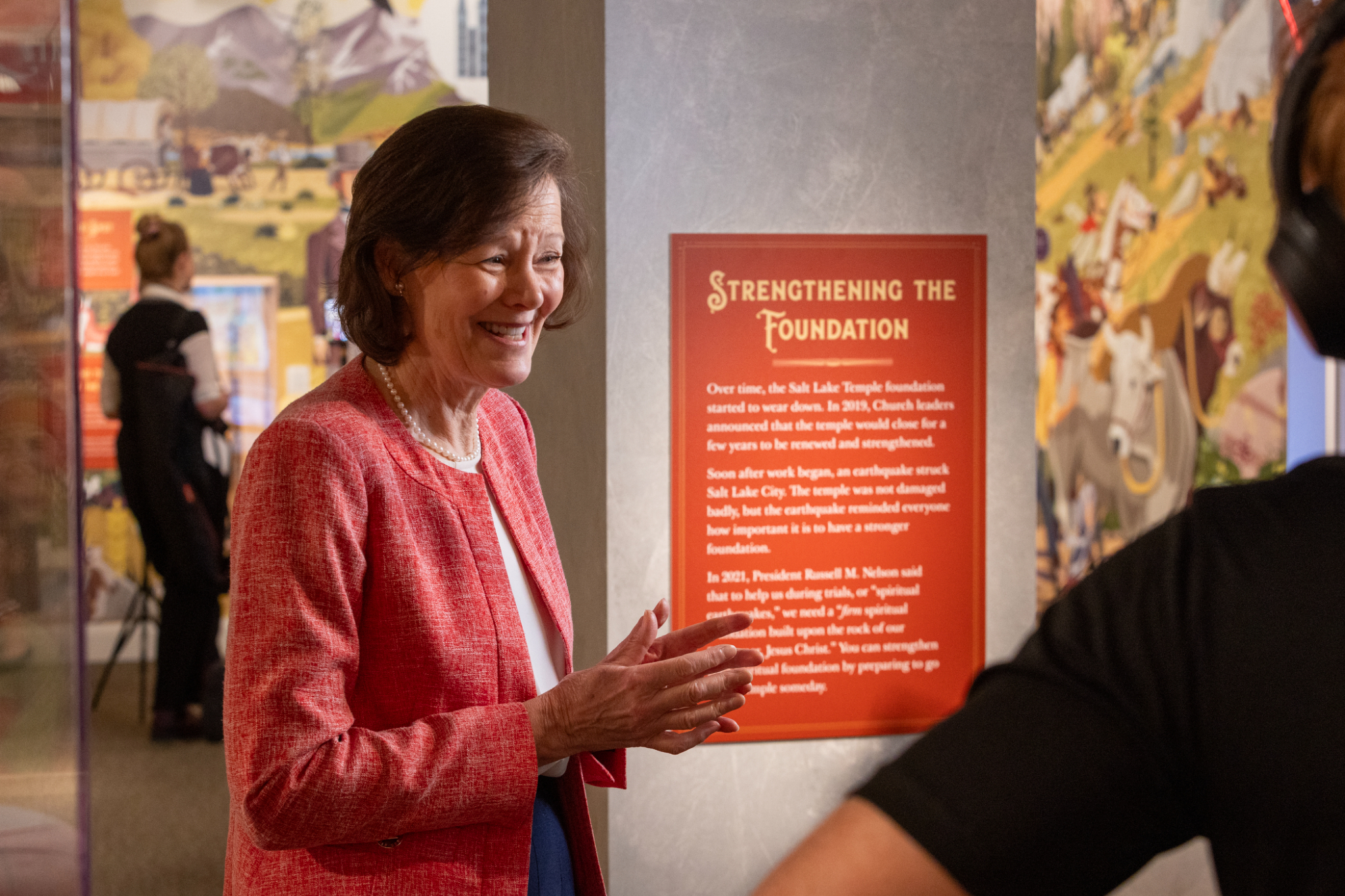 Primary General President Susan H. Porter talks to members of the media about the new children’s exhibit, “A Firm Foundation,” during an event at the Church History Museum in Salt Lake City, on Thursday, March 19, 2026.2026 by Intellectual Reserve, Inc. All rights reserved.Guests can also watch an animated film about the Salt Lake Temple’s history and take a picture in an ox yoke. Throughout the gallery, children are reminded that while the building is impressive, the most important part of the temple is what happens inside — the sacred work of uniting families for eternity.