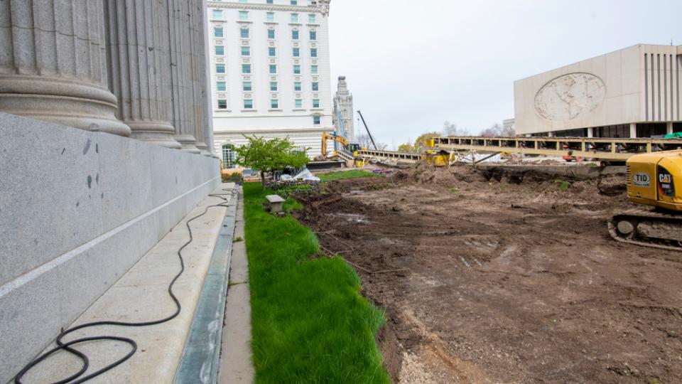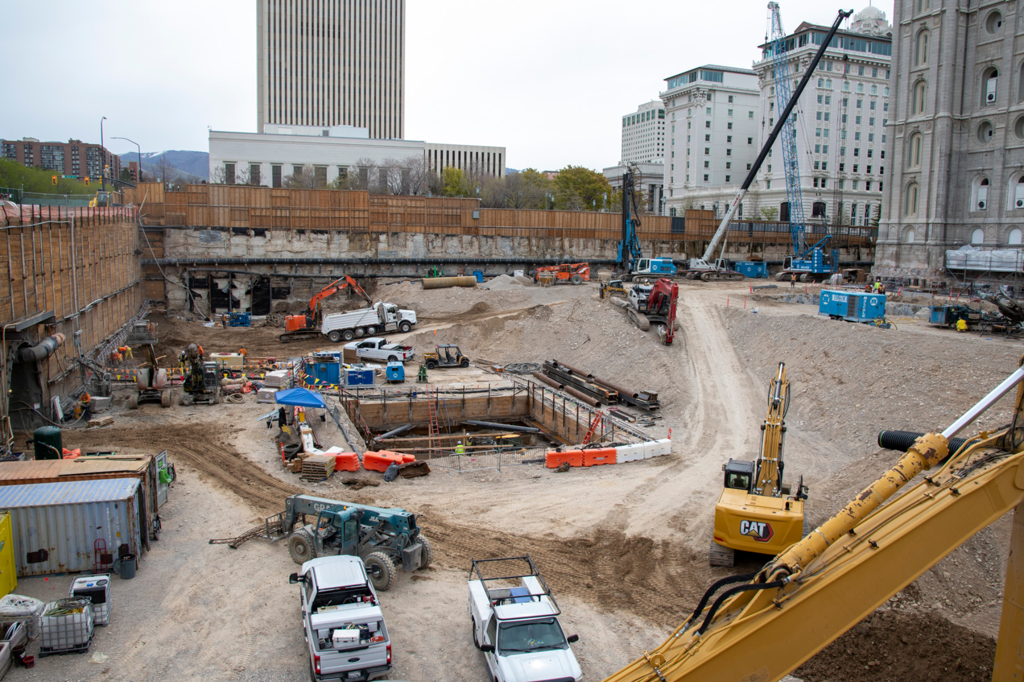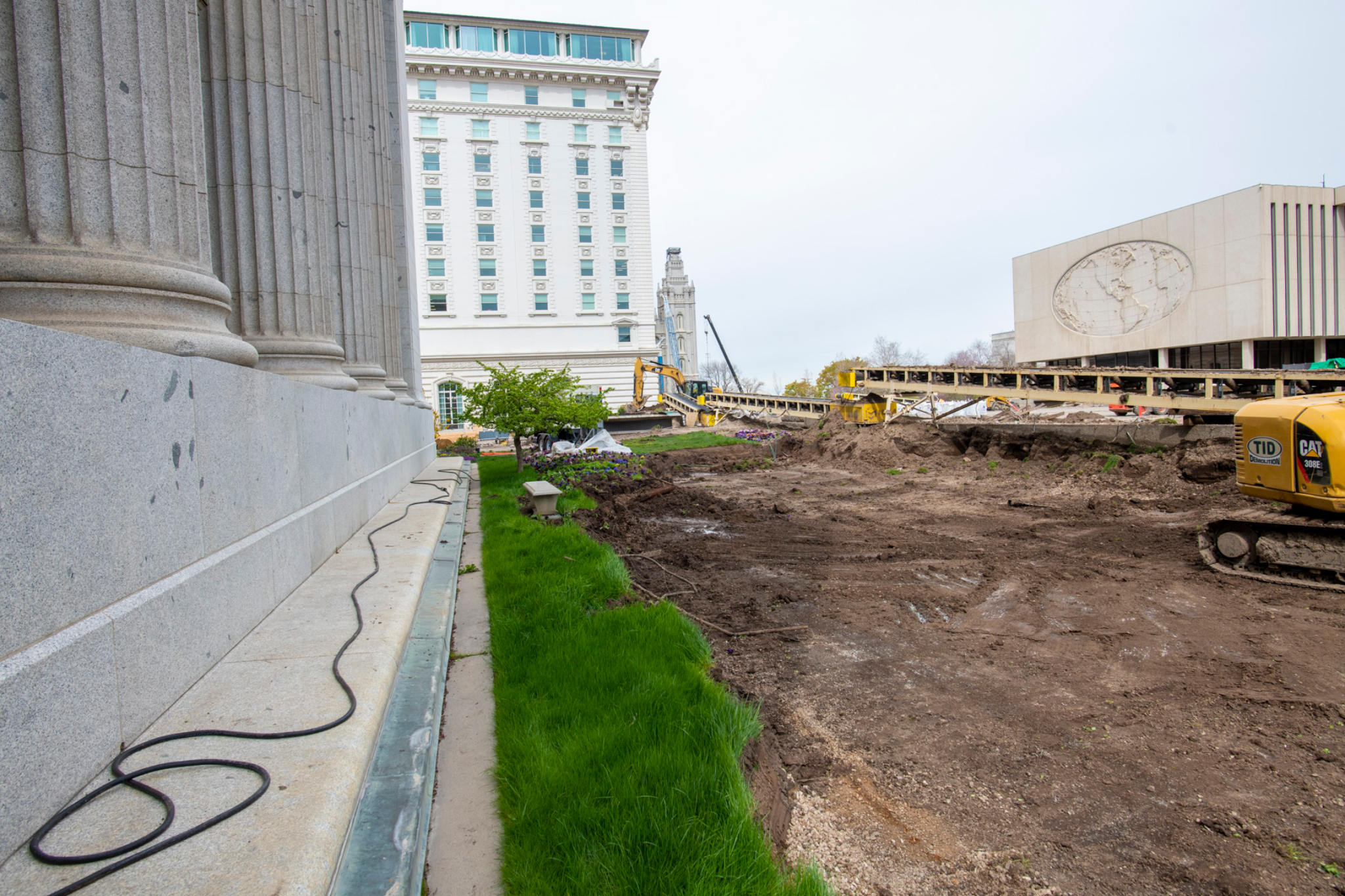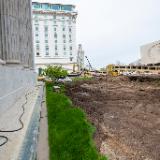 This photo looks west at the renovation of the Church Office Building plaza. The Church Administration Building (left), the Joseph Smith Memorial Building (middle) and Church Office Building (right) are also shown. Crews are using conveyor belts to move soil and debris to a truck loading location. Trucks enter the site from North Temple and exit onto South Temple.
