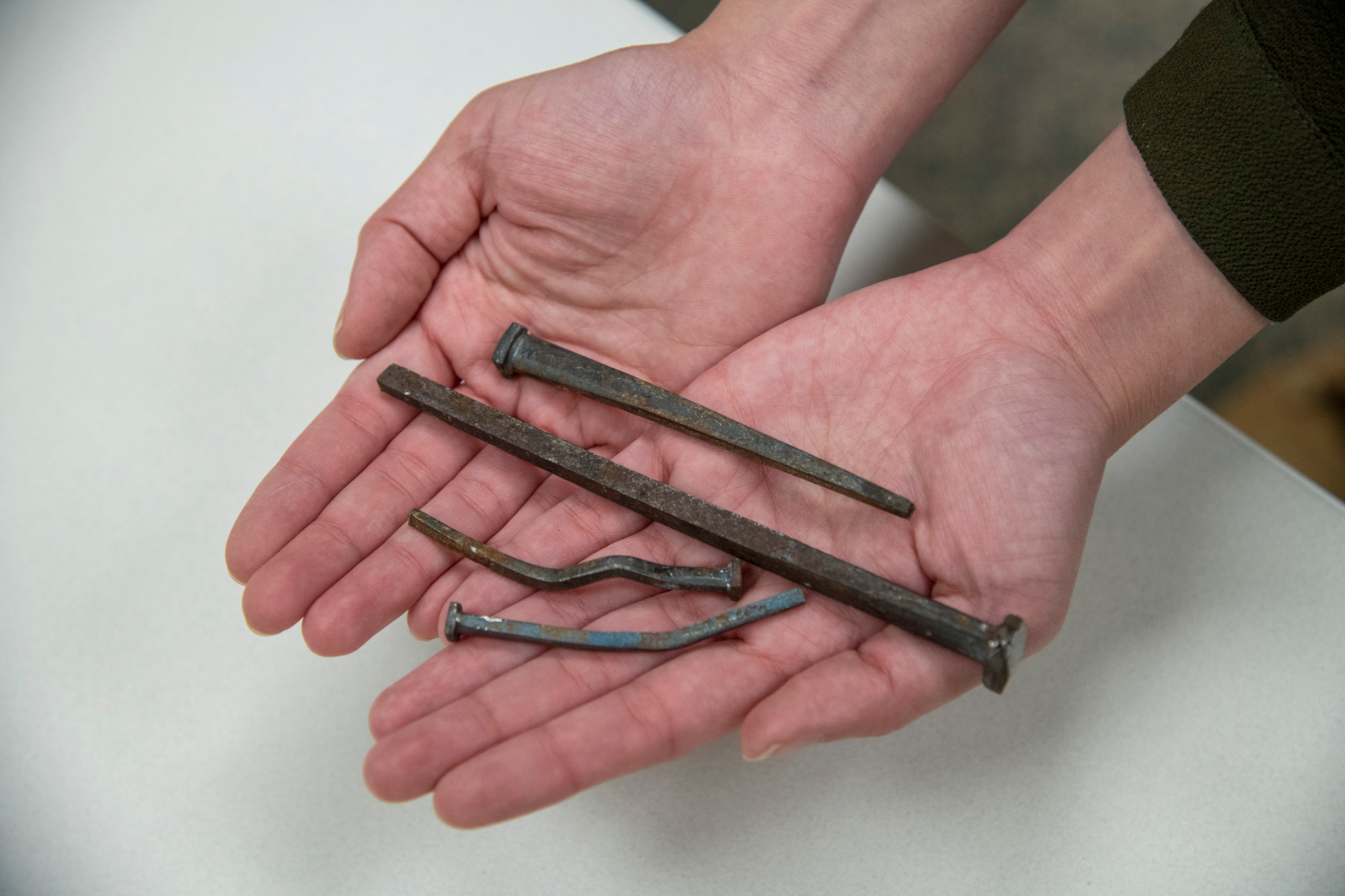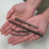 Finally, below are several square-headed nails that crews have found in the temple. These show some of the workmanship and materials used to build the Salt Lake Temple, which was finished in 1893. The longest nails are six inches (15 centimeters) long and show few signs of corrosion.