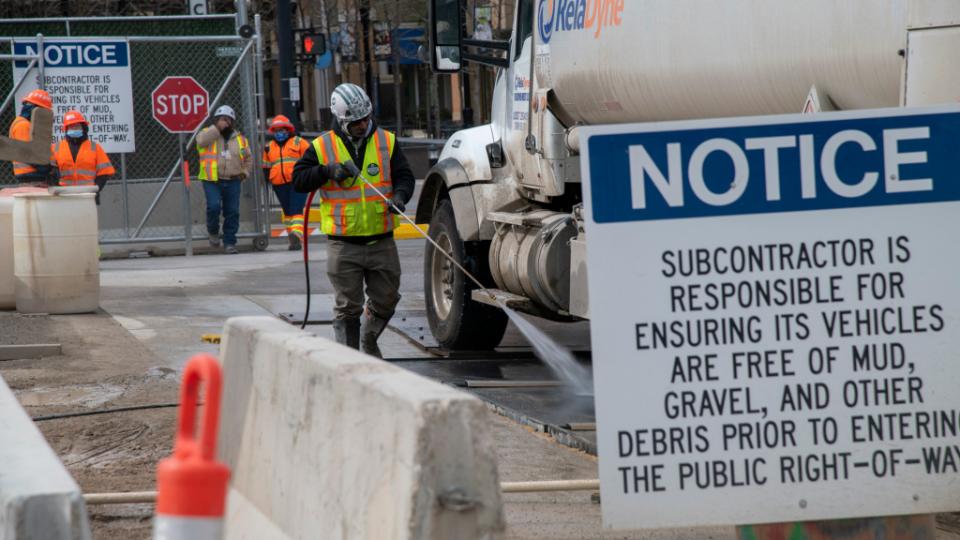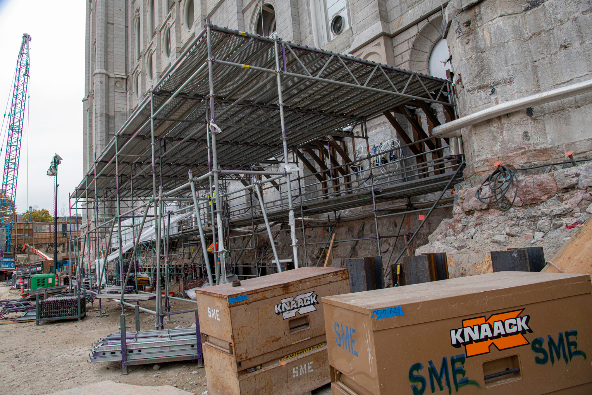 To keep Salt Lake City clean, the renovation site has a truck washing bay. Before vehicles exit the temple renovation site onto South Temple street, wheels, axles, mud flaps and other parts of each vehicle are thoroughly sprayed.