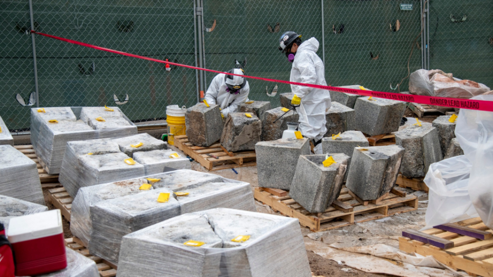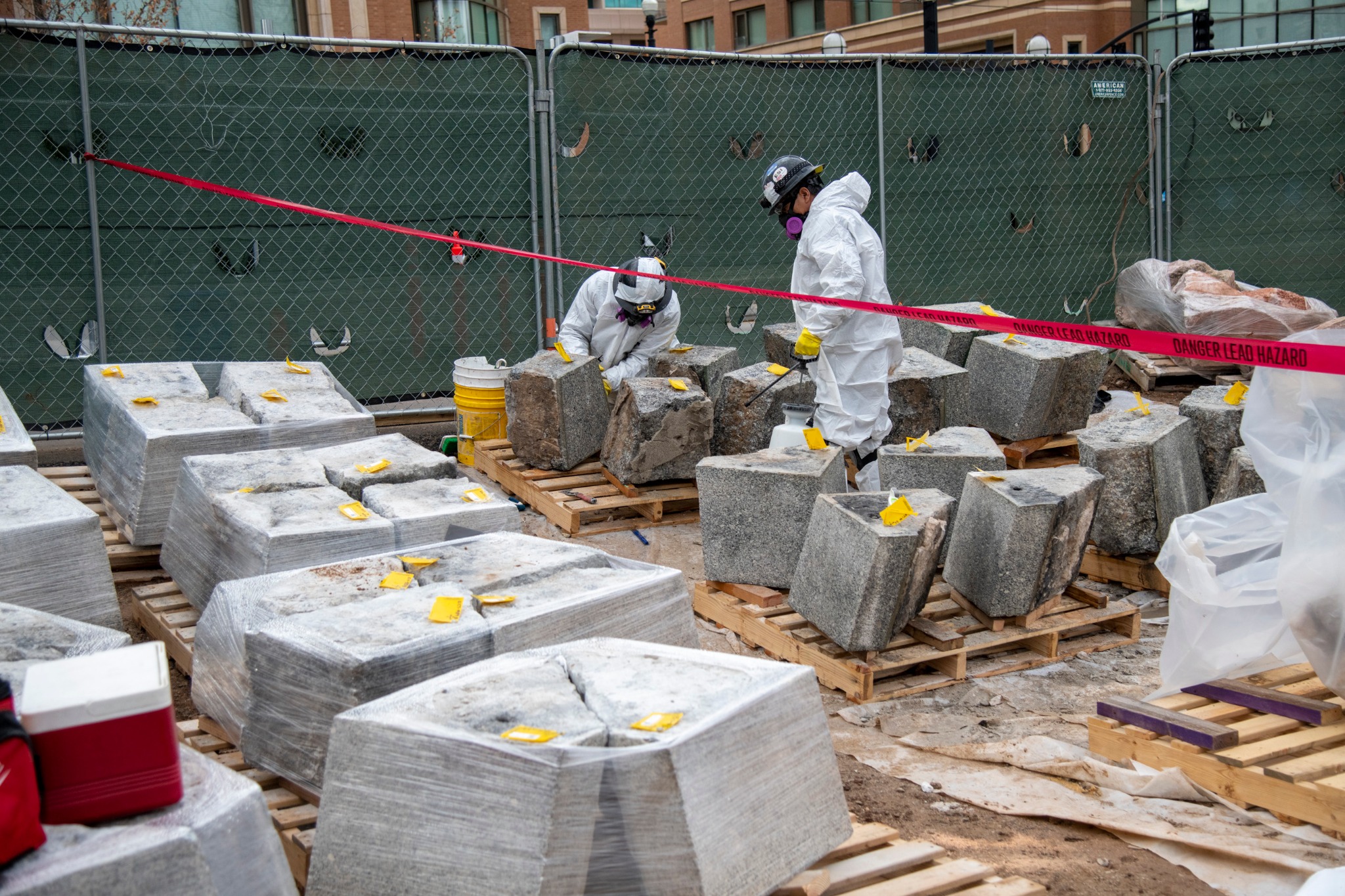 The stones along the upper walls of the temple are all being removed. As they are lifted off with a crane and placed in the ground, they are labeled. These will be placed in storage, cleaned, and repaired, and will ultimately return to their original places.