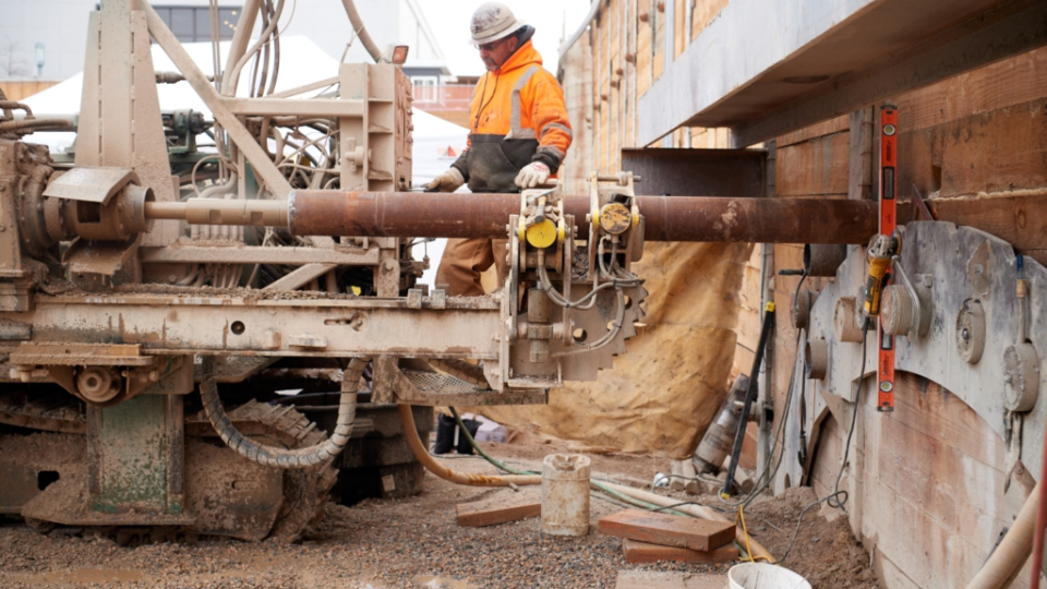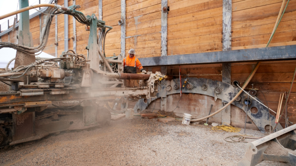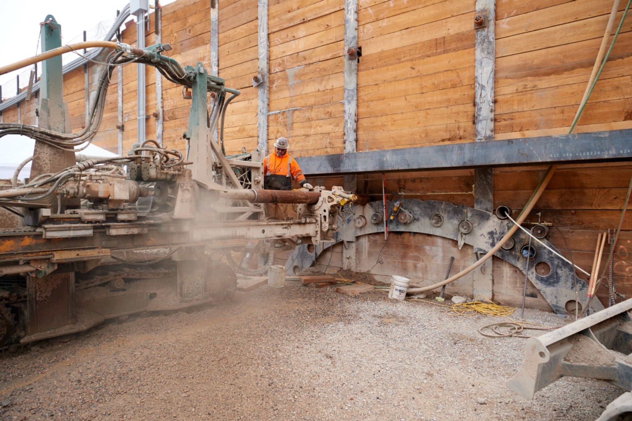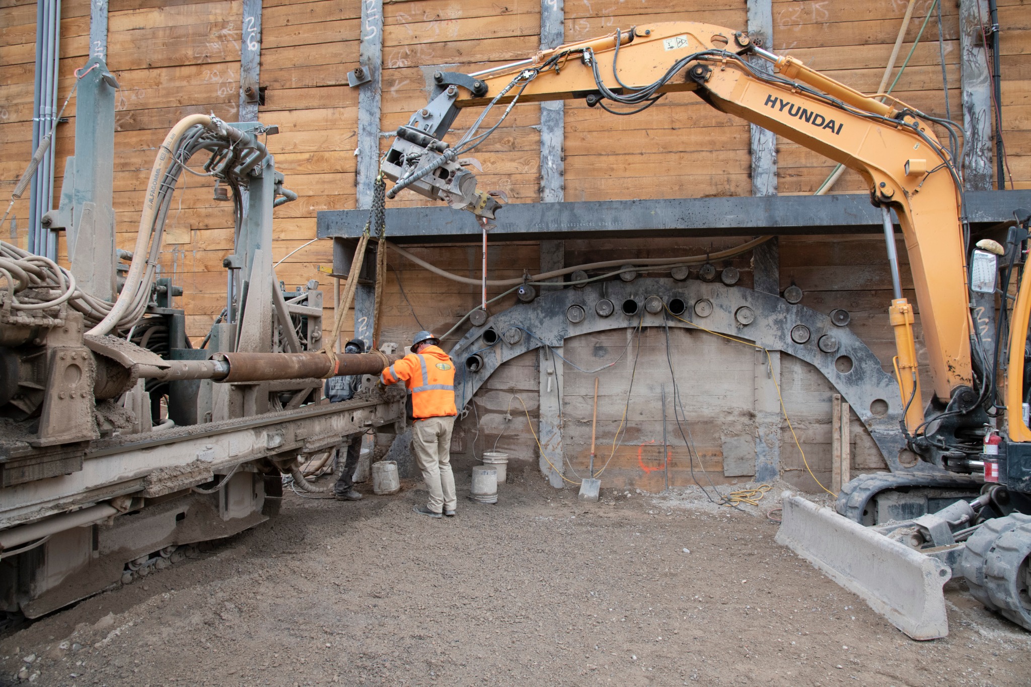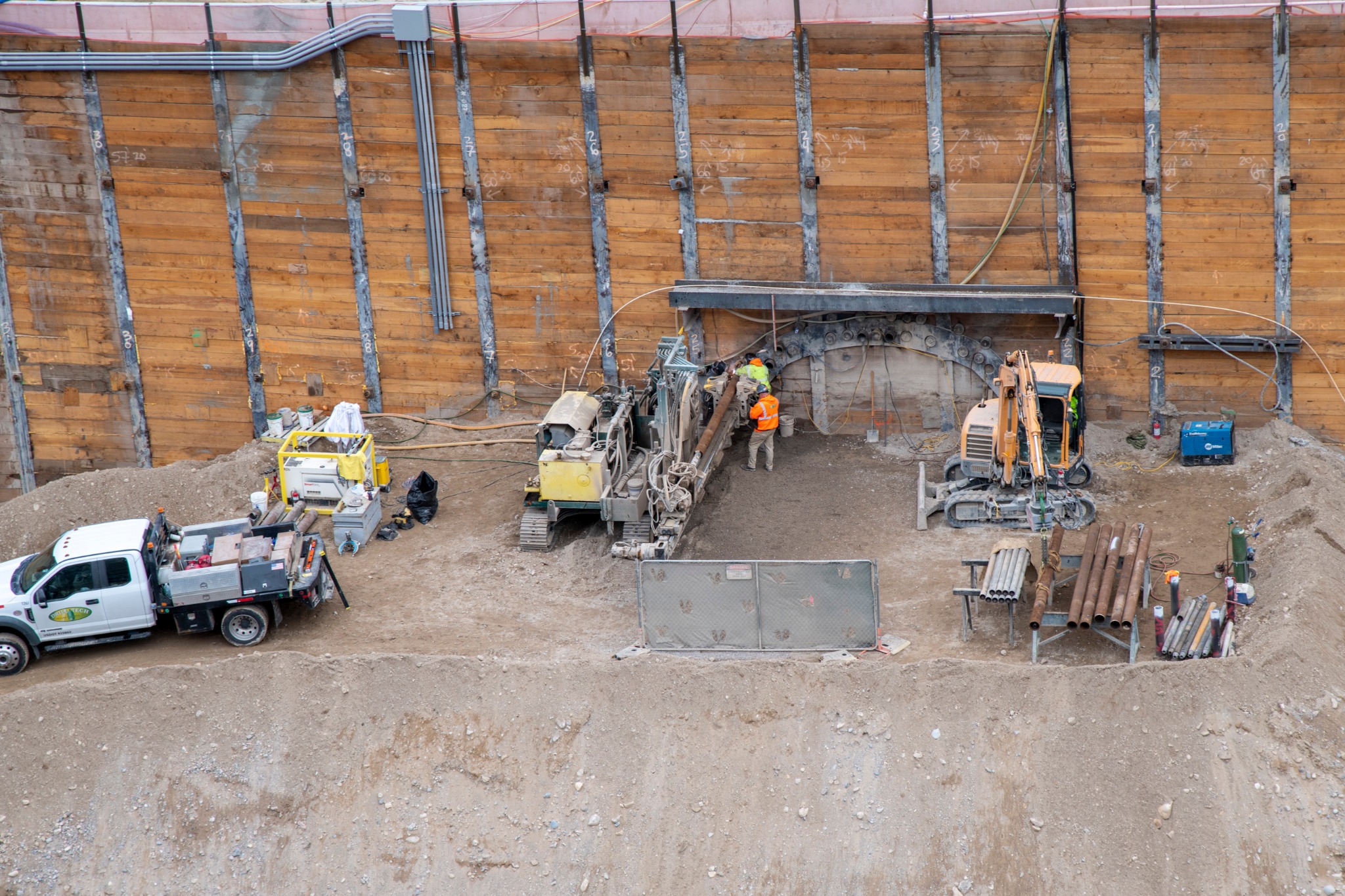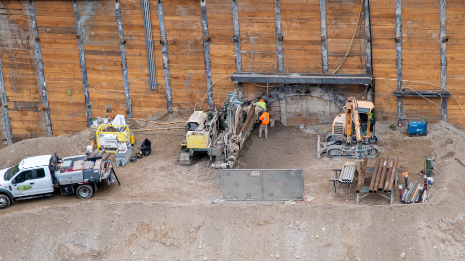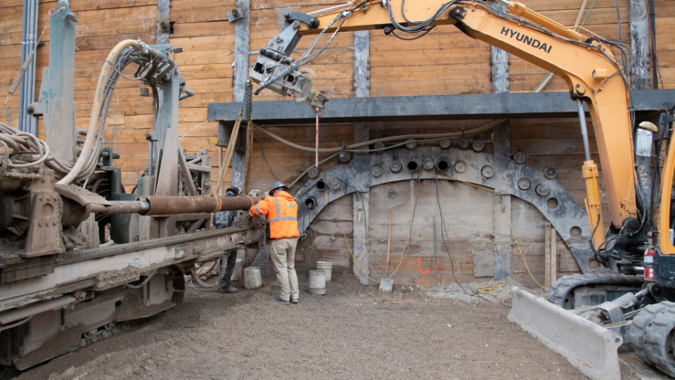 In this photo below, drilling on the temple side consists of installing canopy tubes to create a structure that will support further excavation.