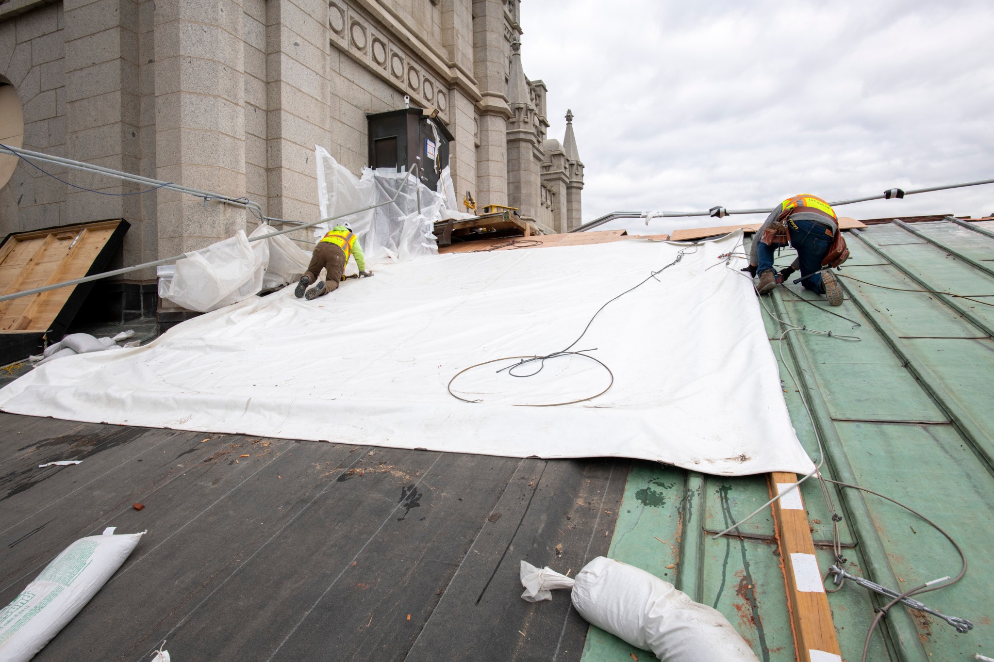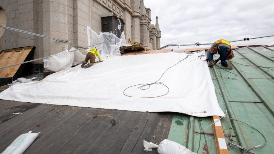 As part of the seismic upgrade of the temple, the existing roof is also being upgraded. The roof will be gradually removed and have a temporary covering (similar to a heavy-duty tarp) until the new roof is completed.