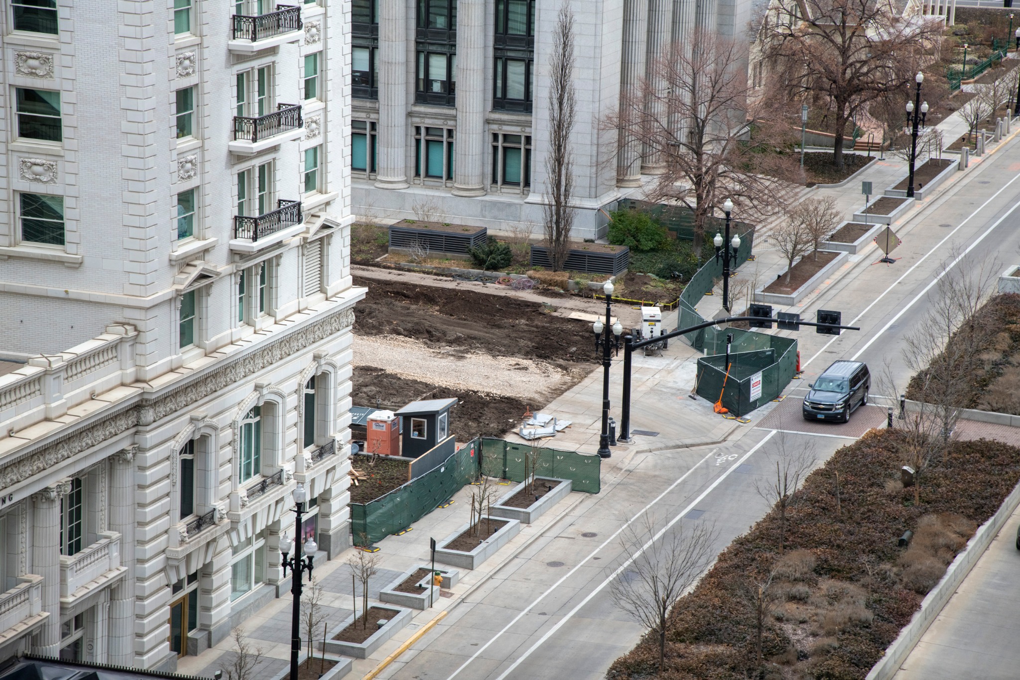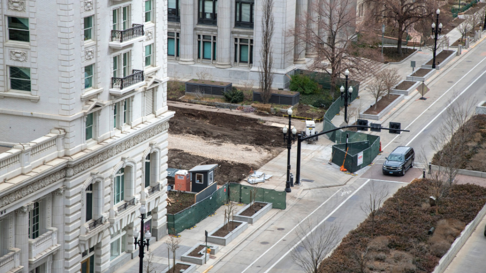 The plaza work that was announced in January 2021 is now visibly underway. The area between the Church Administration Building and the Joseph Smith Memorial Building is being used as a road to help move materials in and out of the plaza as the renovation continues.