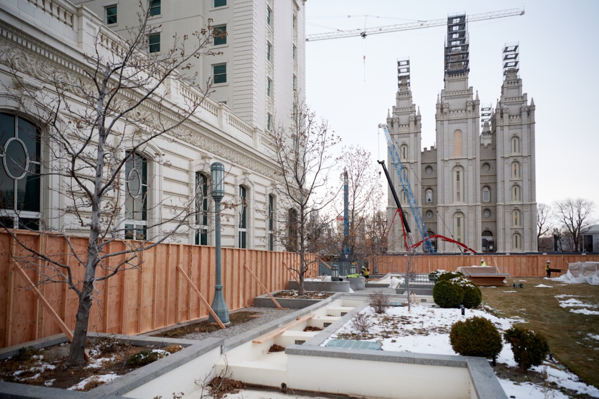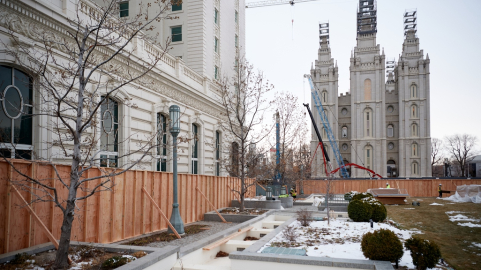 As part of the Salt Lake Temple renovation project, the grounds around the temple are also being renovated. In January, construction began on the Church Office Building plaza. Temporary fencing was first put in place, which has been followed by more permanent fencing.