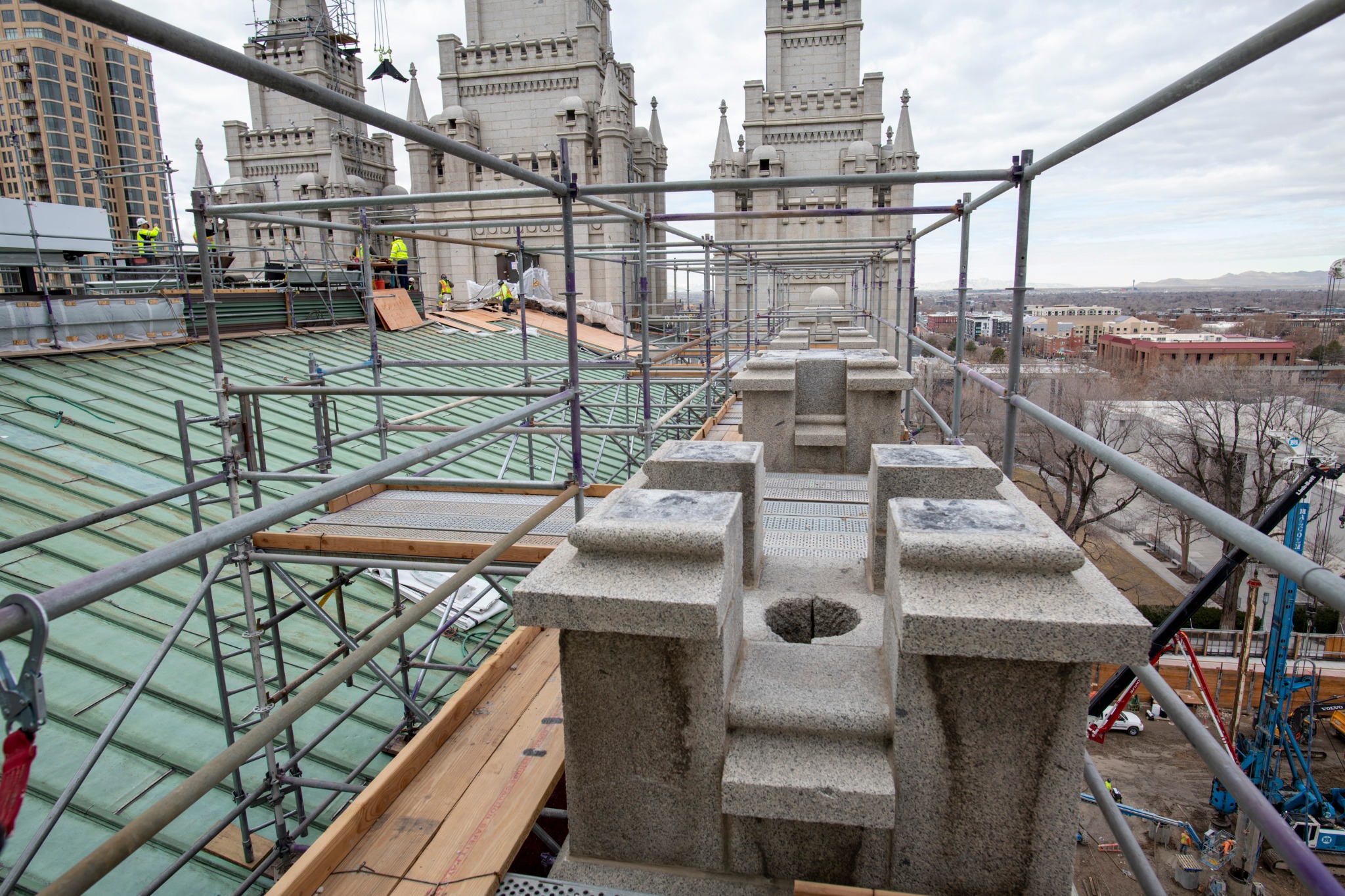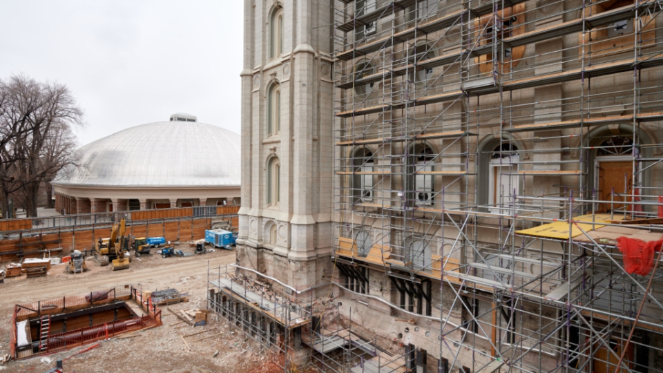 Near the southwest corner of the temple, shoring and excavation are complete for the installation of a worker/material lift. Due to the proximity to the foundation of the temple, the shoring ensures the lift excavation does not disturb the temple foundation. The lift will allow for easier access of workers and materials into the interior of the temple’s upper floors.