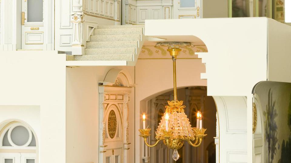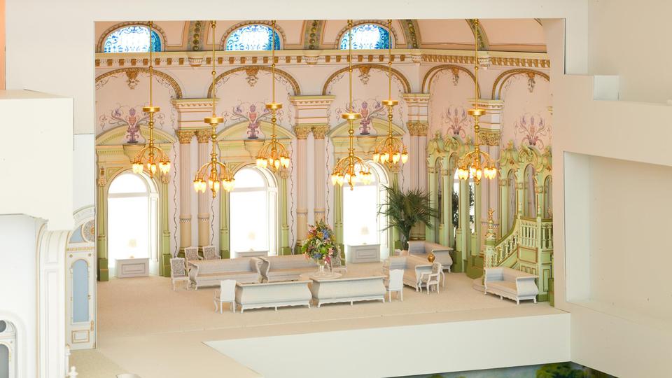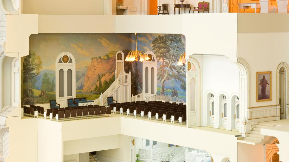 The model of the Salt Lake Temple sits in front of a giant window in the South Visitors’ Center facing the actual building that it replicates. The south and east walls of the replica have been cut away to show depictions of many of the rooms in the temple, including the large assembly hall and rooms where the First Presidency and Quorum of the Twelve Apostles meet. The baptistery and other ordinance rooms are also depicted. Close attention is paid to detail, and even paintings, furniture and working chandeliers and lamps imitate those found in the actual temple.