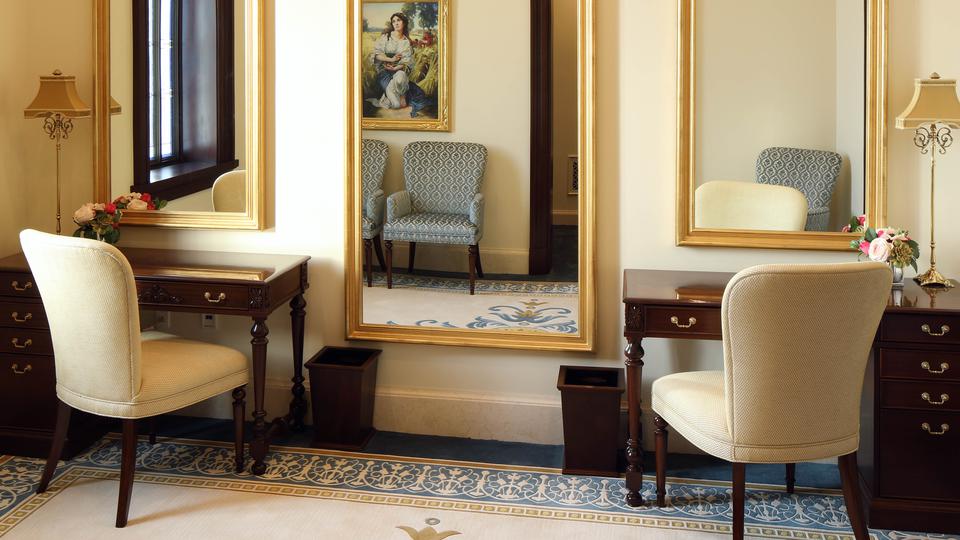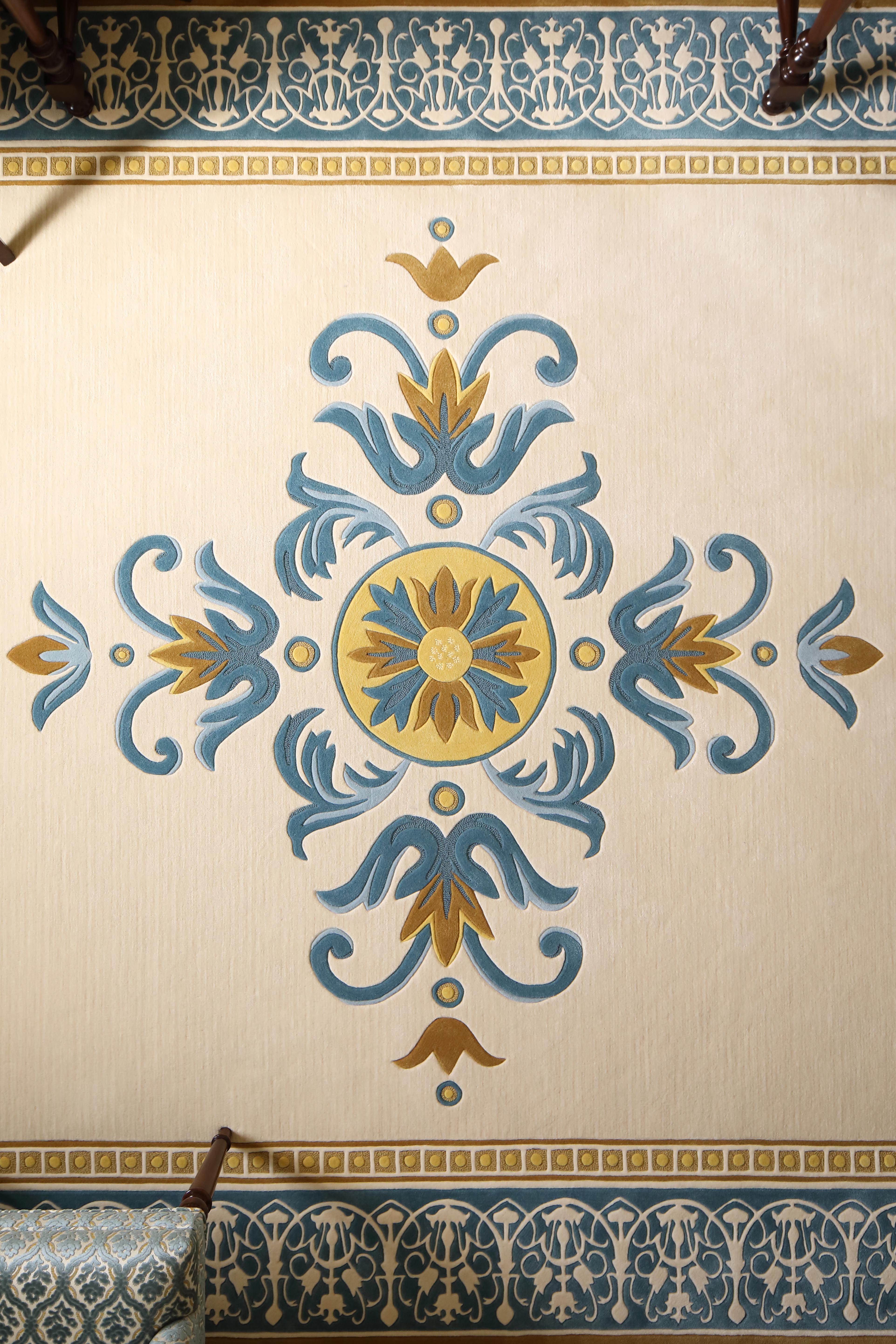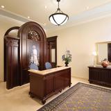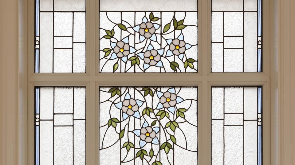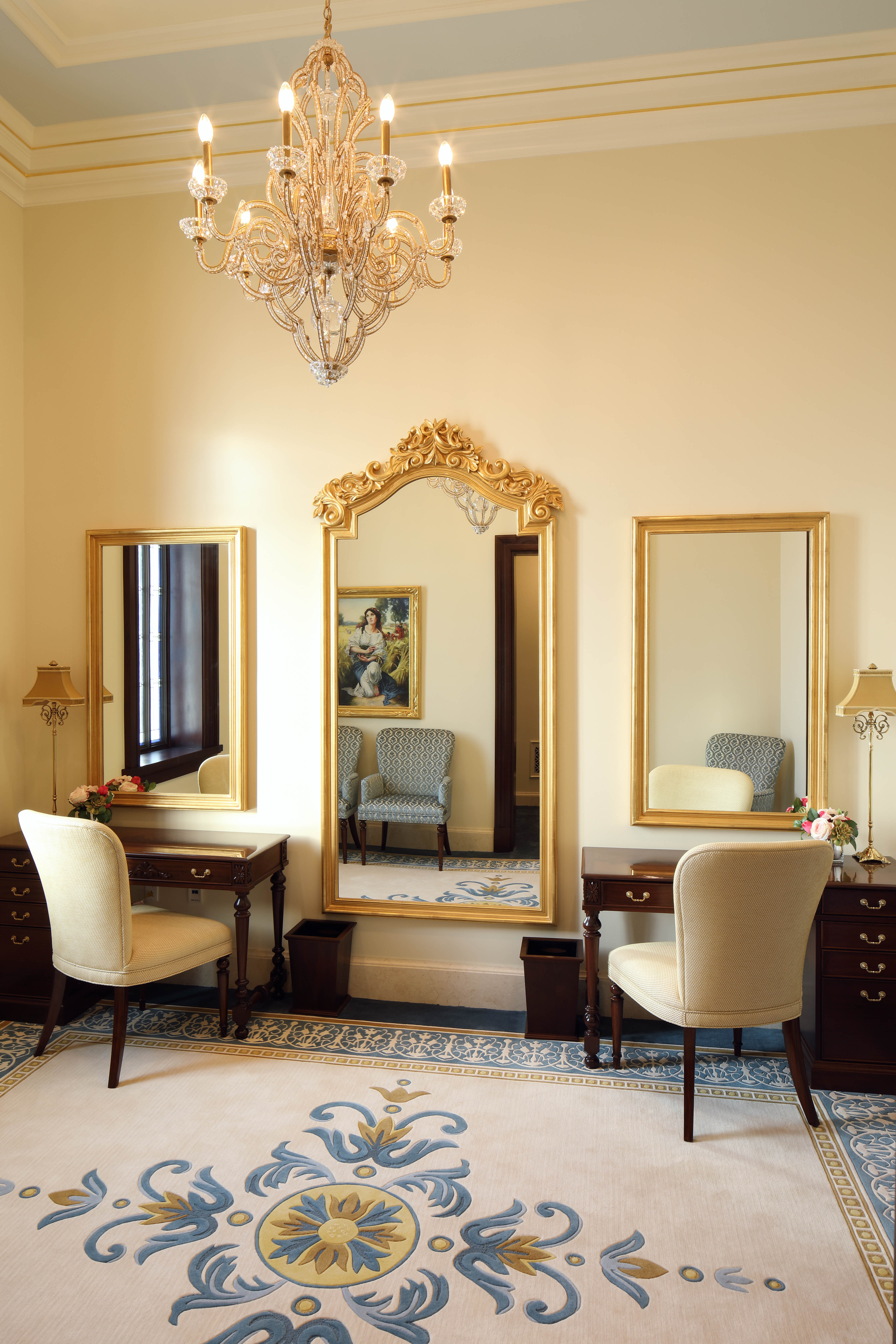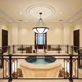The interior features original art glass, custom rugs with Colombian motifs in blue and gold, wrought iron and bonze railings and a grand staircase. Also featured are carved wood and glass of the Cayena hibiscus, the official flower of Barranquilla City.