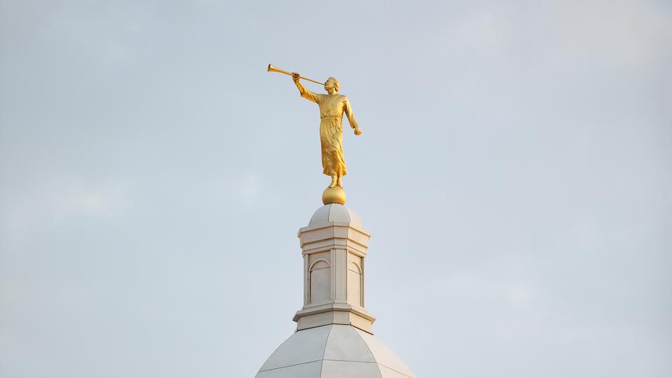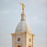 The temple stands 107 feet tall (34.5 meters) and is crowned with a gilded statue of Moroni, a Book of Mormon prophet who is significant to Latter-day Saints for his role in the Restoration of the gospel of Jesus Christ.