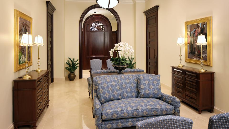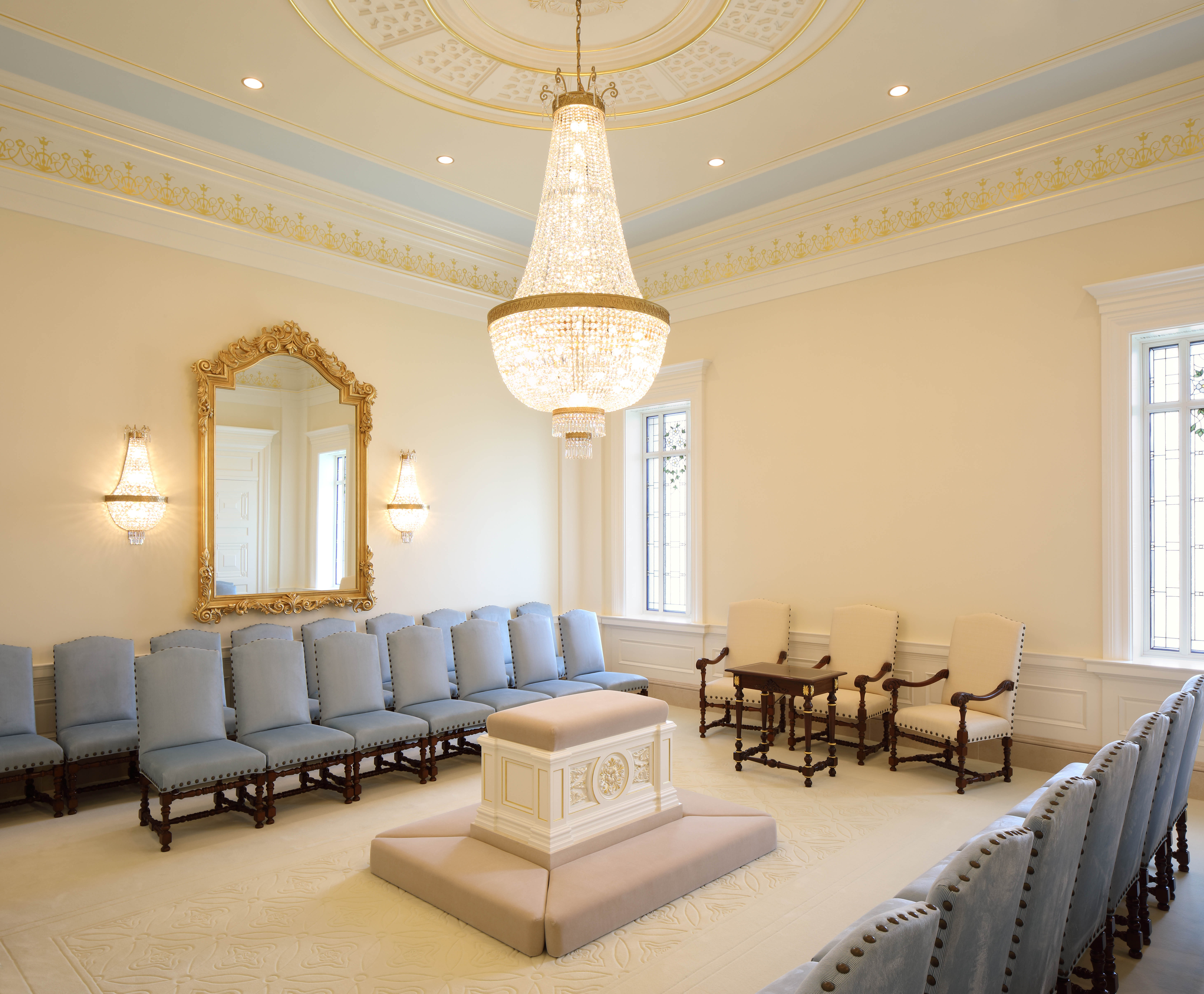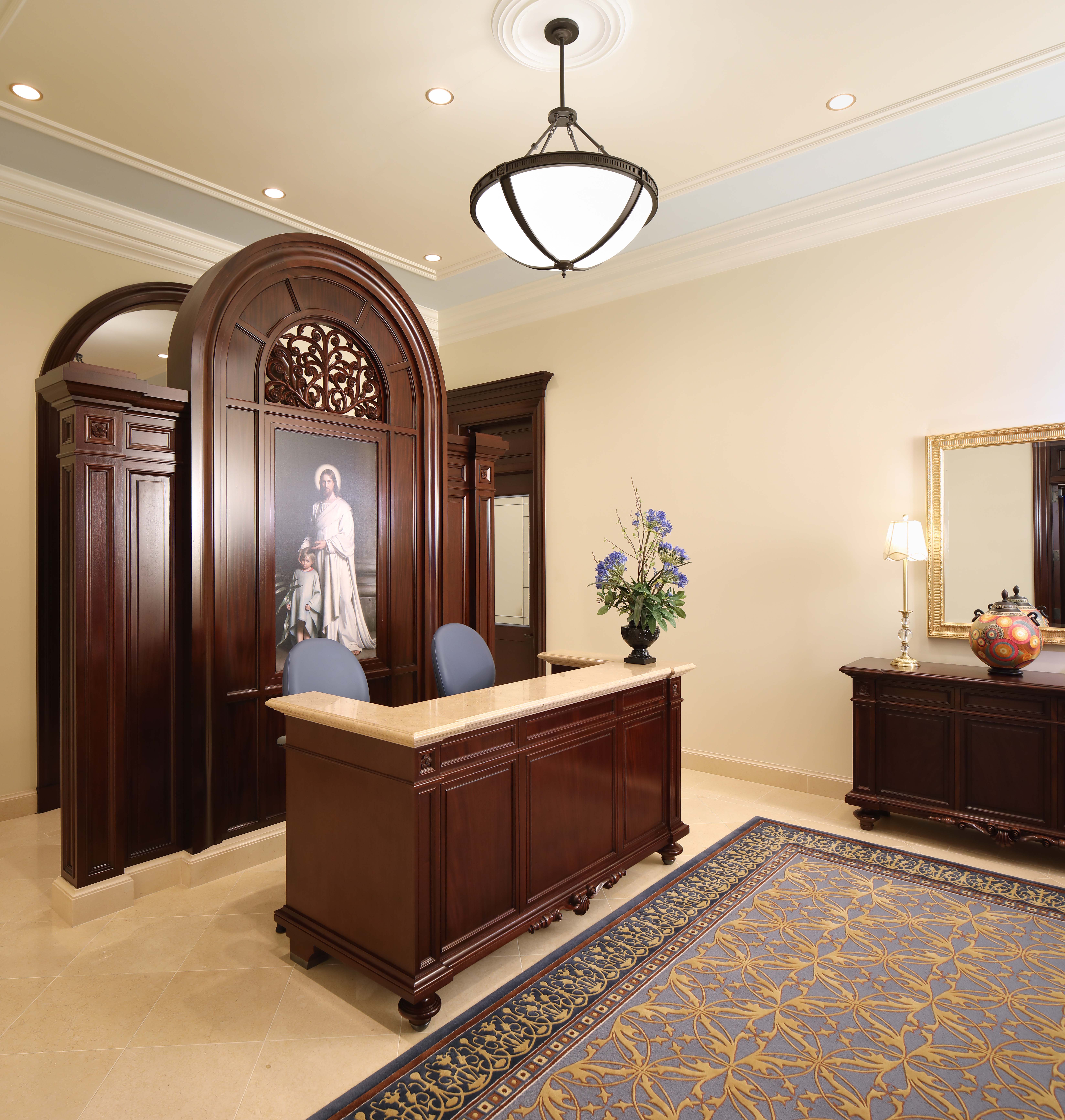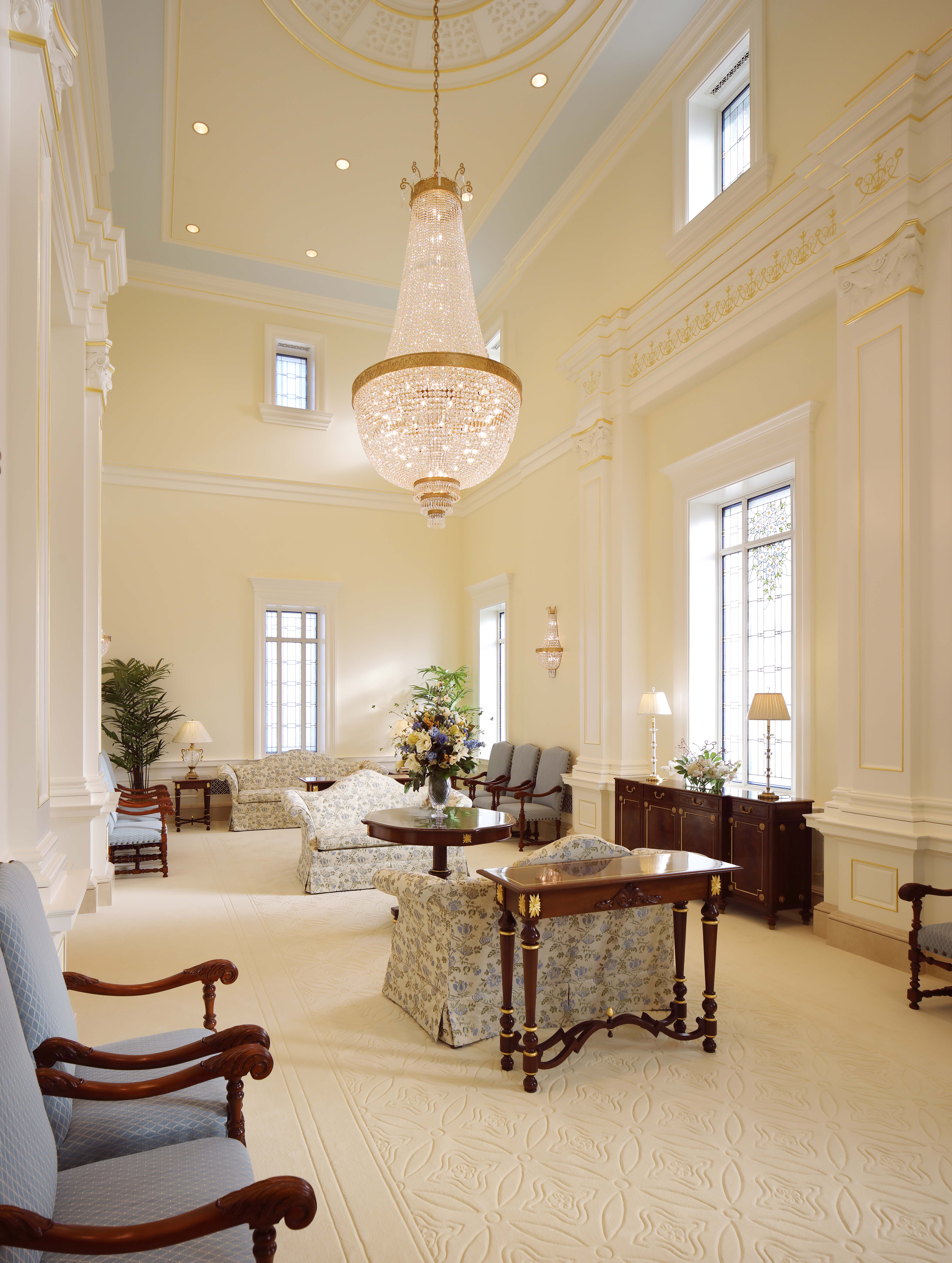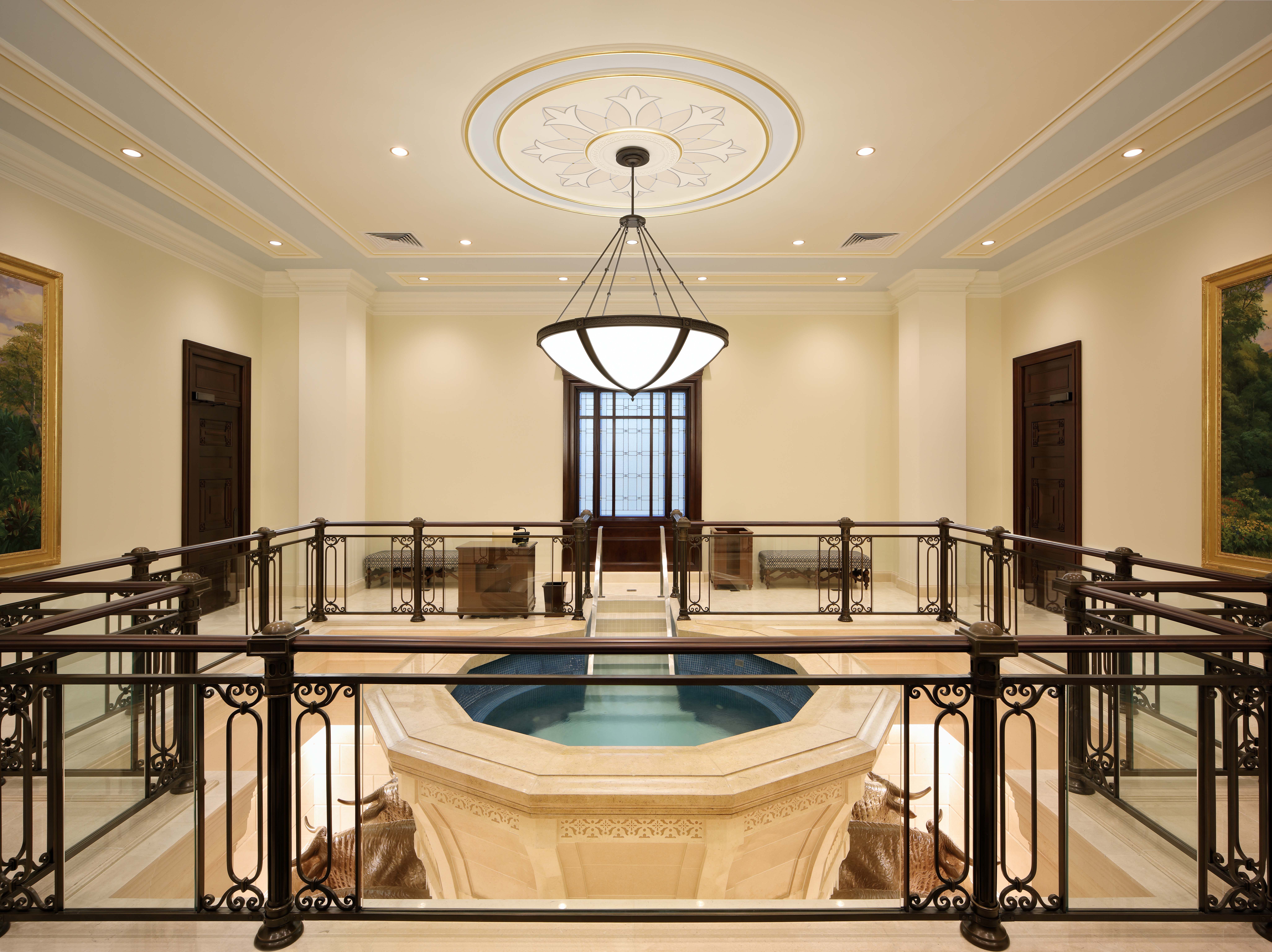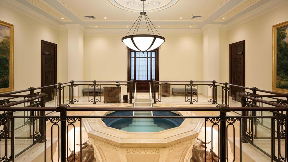 The 24,000-square-foot temple was designed to reflect the neoclassic architecture of Colombia’s Republic period, which followed independence from Spain in the early 19th century and is still reflected in historic religious and secular buildings found in major cities throughout Colombia. Like many of these same buildings, the temple’s exterior is clad with limestone and topped with carved parapets, a dome and a cupola.