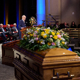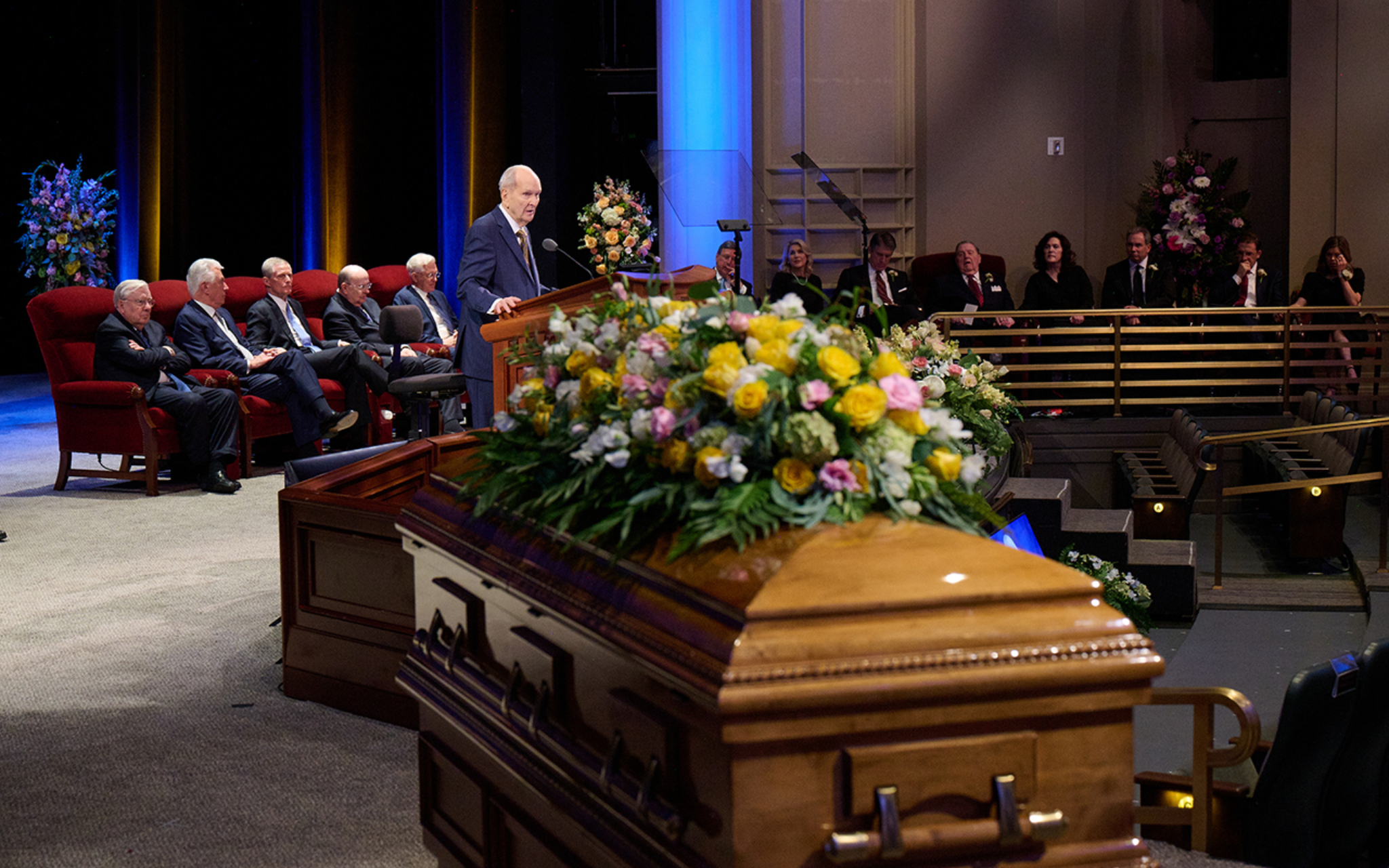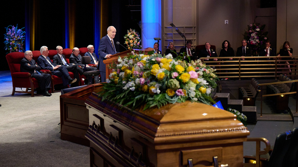 As the concluding speaker at the service held in the Conference Center Theater in Salt Lake City, the President of the Church acknowledged Sister Holland’s multi-faceted service and example — as wife of Elder Jeffrey R. Holland of the Quorum of the Twelve Apostles, a former counselor in the Young Women general presidency and “first lady” at Brigham Young University while her husband served as president.