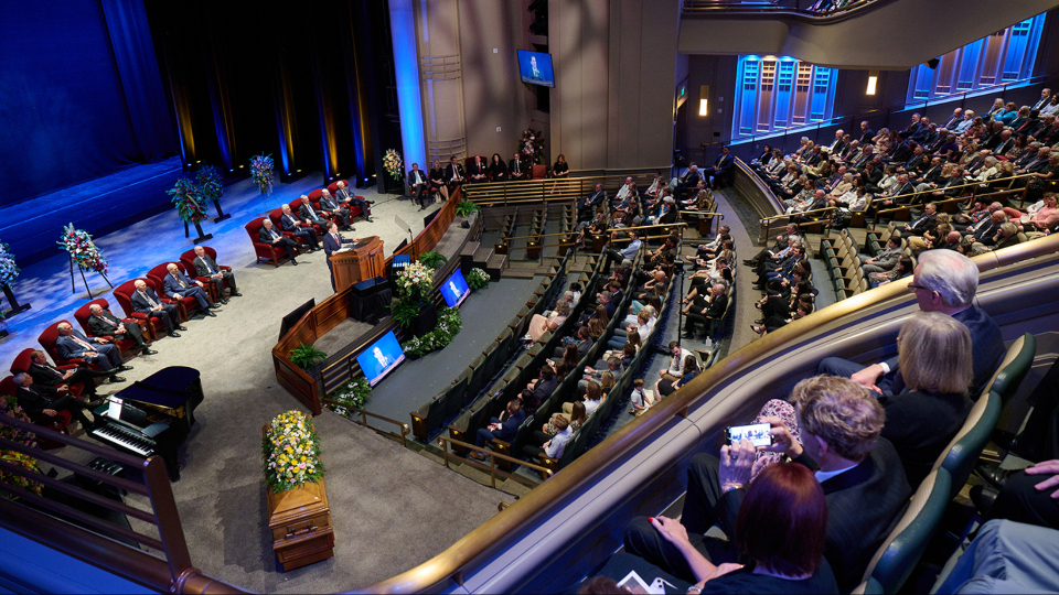 The 850-seat theater was filled to capacity, with overflow spreading to other areas of the Conference Center. The service was broadcast via livestream on ChurchofJesusChrist.org.