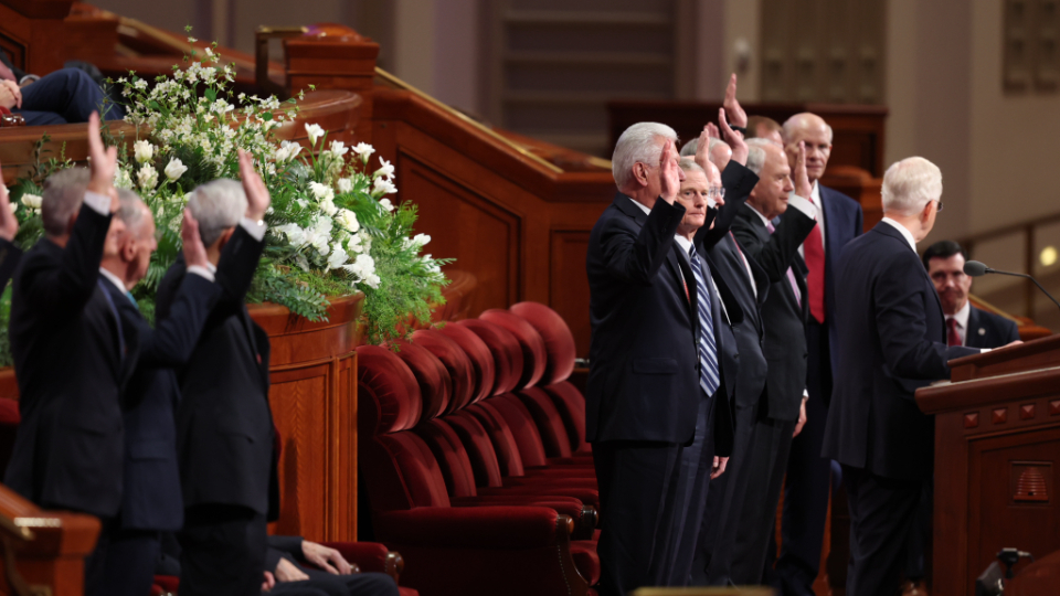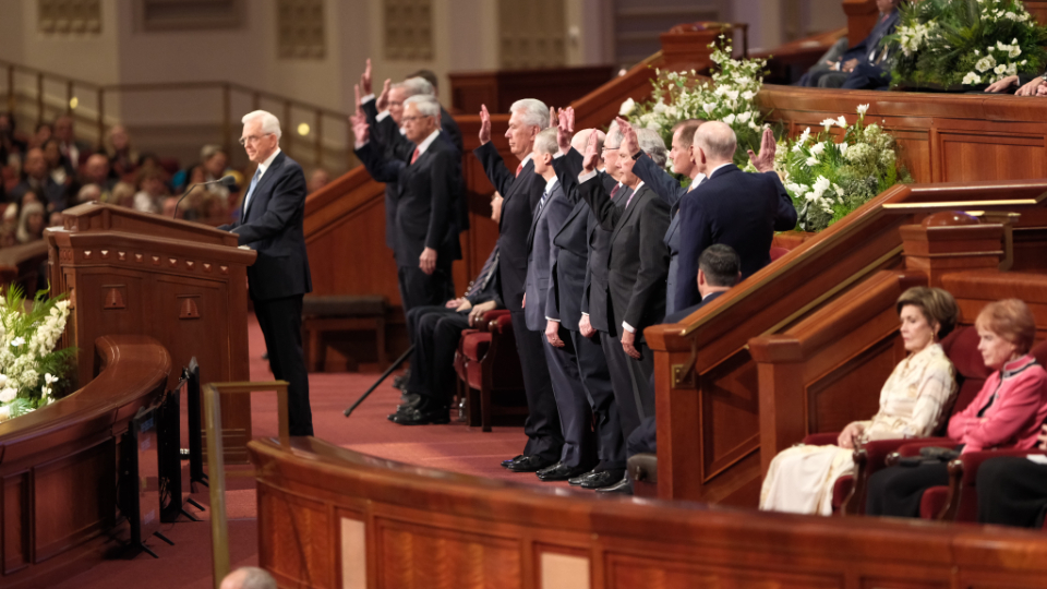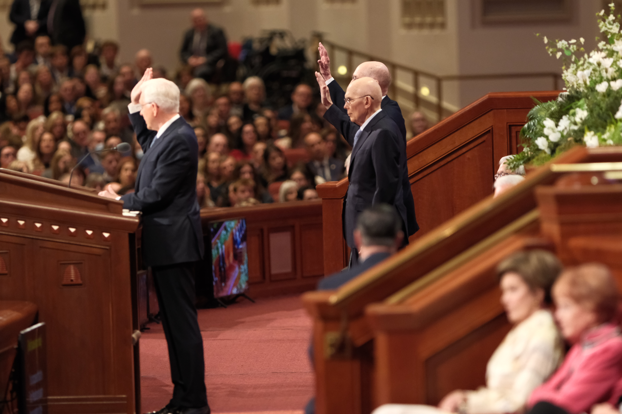 During the Saturday morning session of the April 2026 general conference, Latter-day Saints participated in a solemn assembly. They sustained President Dallin H. Oaks as prophet, seer, and revelator, along with the other members of the First Presidency, the Quorum of the Twelve Apostles, and other senior leaders in their respective roles.