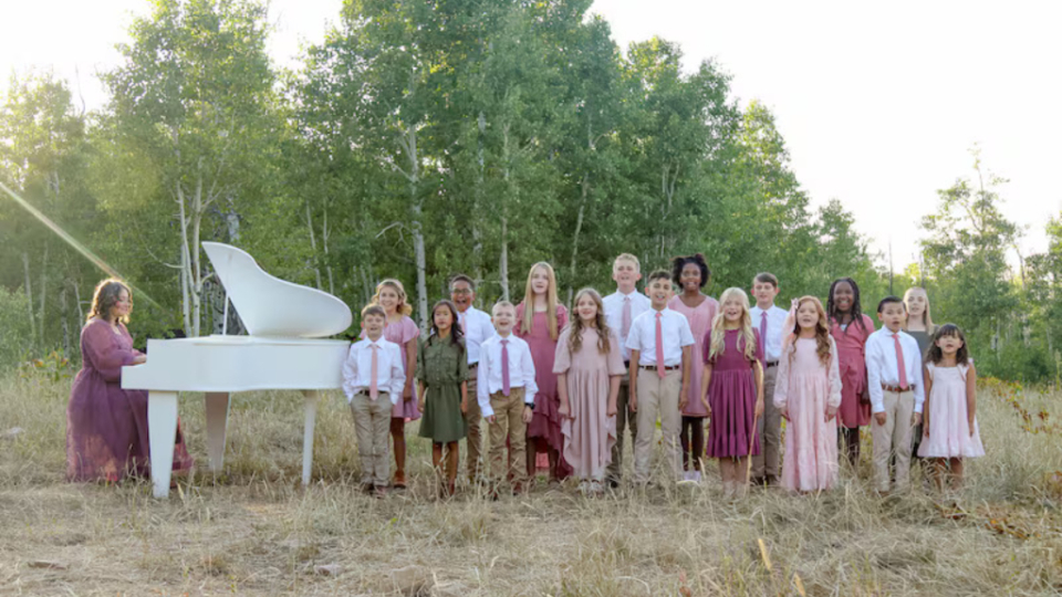 Angie Killian, composer of "Anytime, Anywhere," plays the piano while children sing during the music video shoot for the extended version of "Anytime, Anywhere," in Payson Canyon, 2025. Photo provided by Rachael Olsen, courtesy of Church News.All rights reserved.Killian relented and sent an email that she now thinks probably sounded a little depressing.