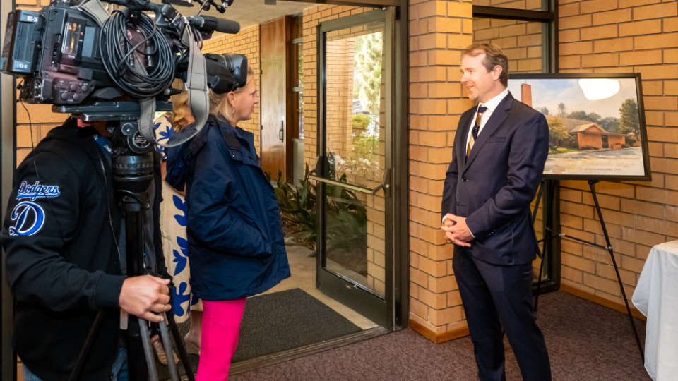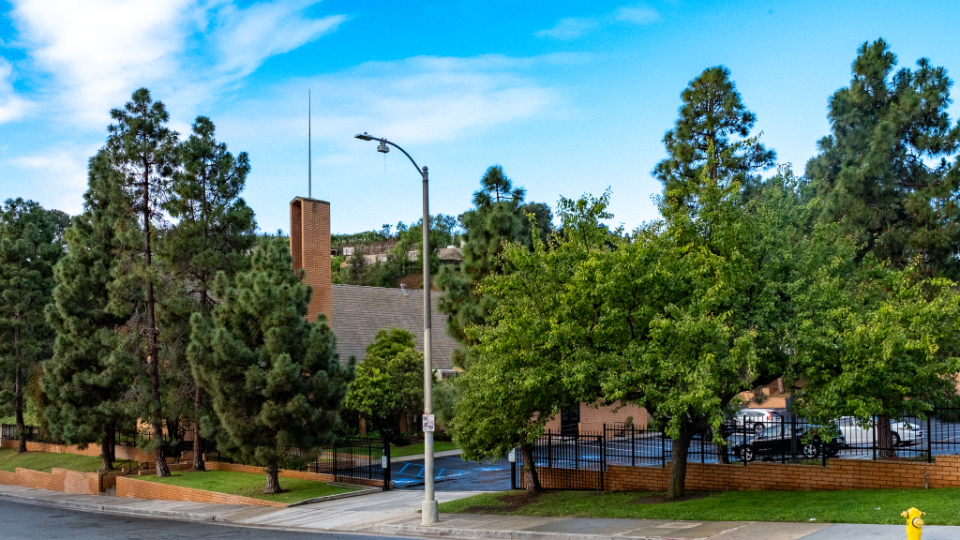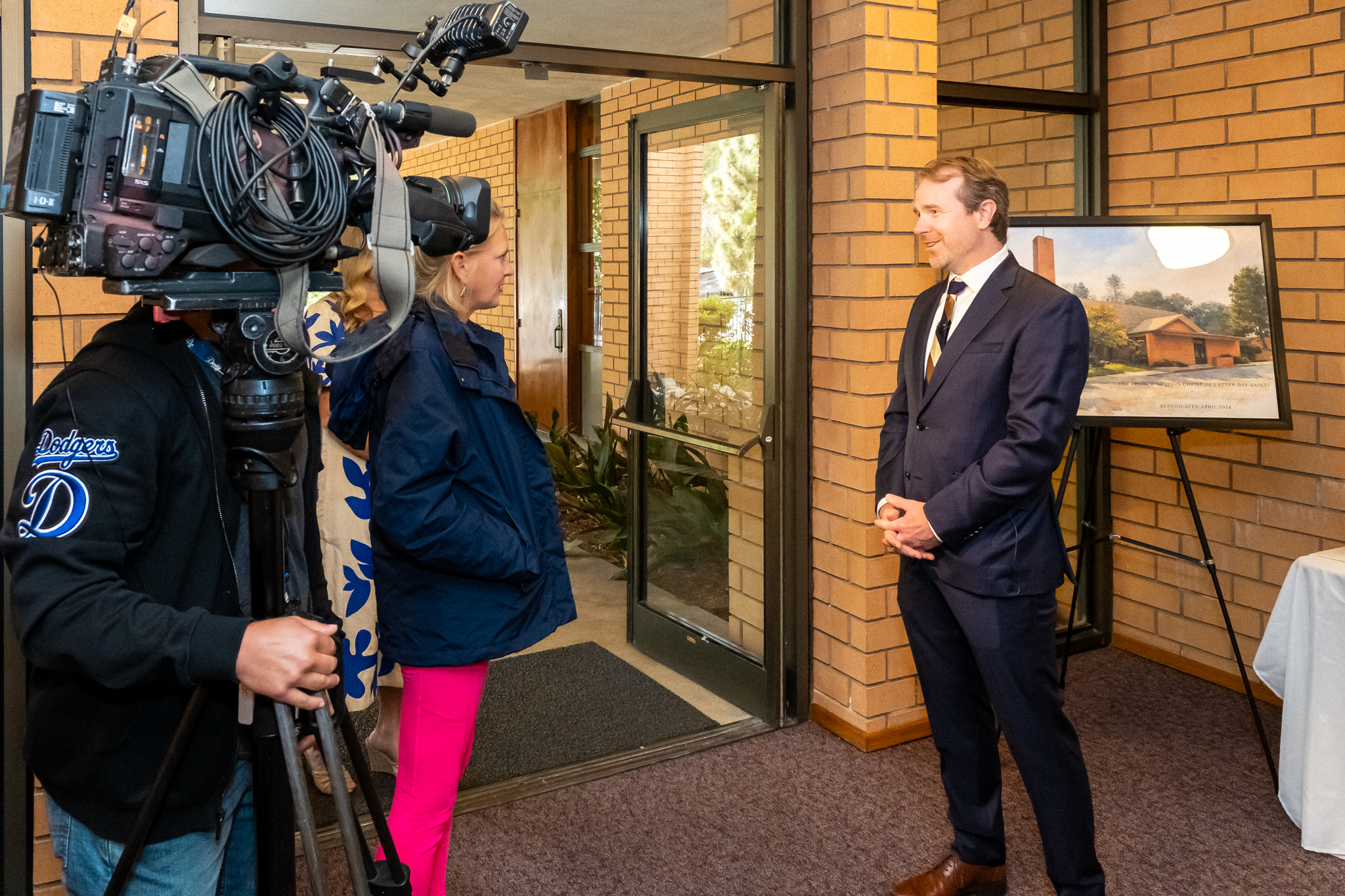 The brick building at 575 Los Liones Drive was left standing but heavily damaged by smoke and ash. Following extensive renovation, Latter-day Saints gathered for the building’s rededication on Sunday, April 12, 2026. Los Angeles media also toured the building, built over half a century ago, before the worship service.
