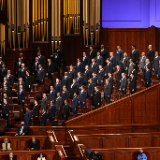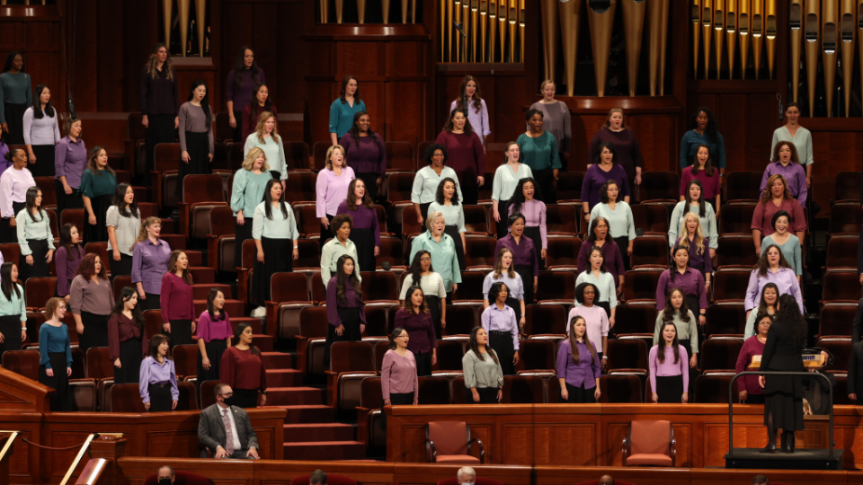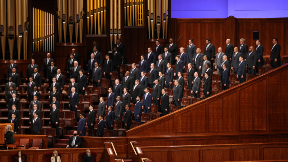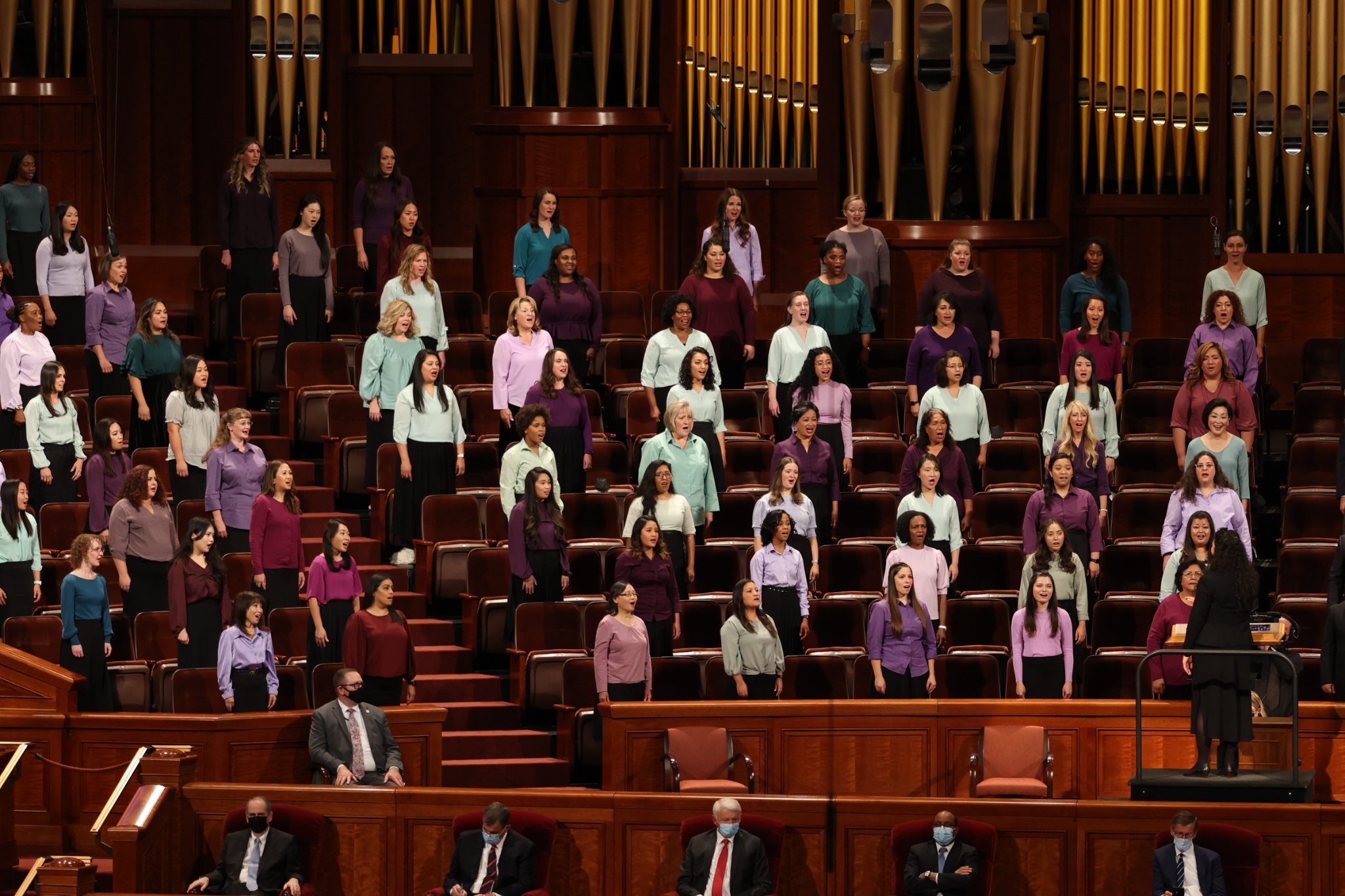 Even though Church leaders still sat with faces partially obscured by face masks, they did so from the spacious auditorium of the Conference Center once again. And despite speaking to mostly empty seats, speakers were again framed by the colorful outfits of choir members, this time a multicultural choir from stakes throughout Utah who provided live music throughout the session.