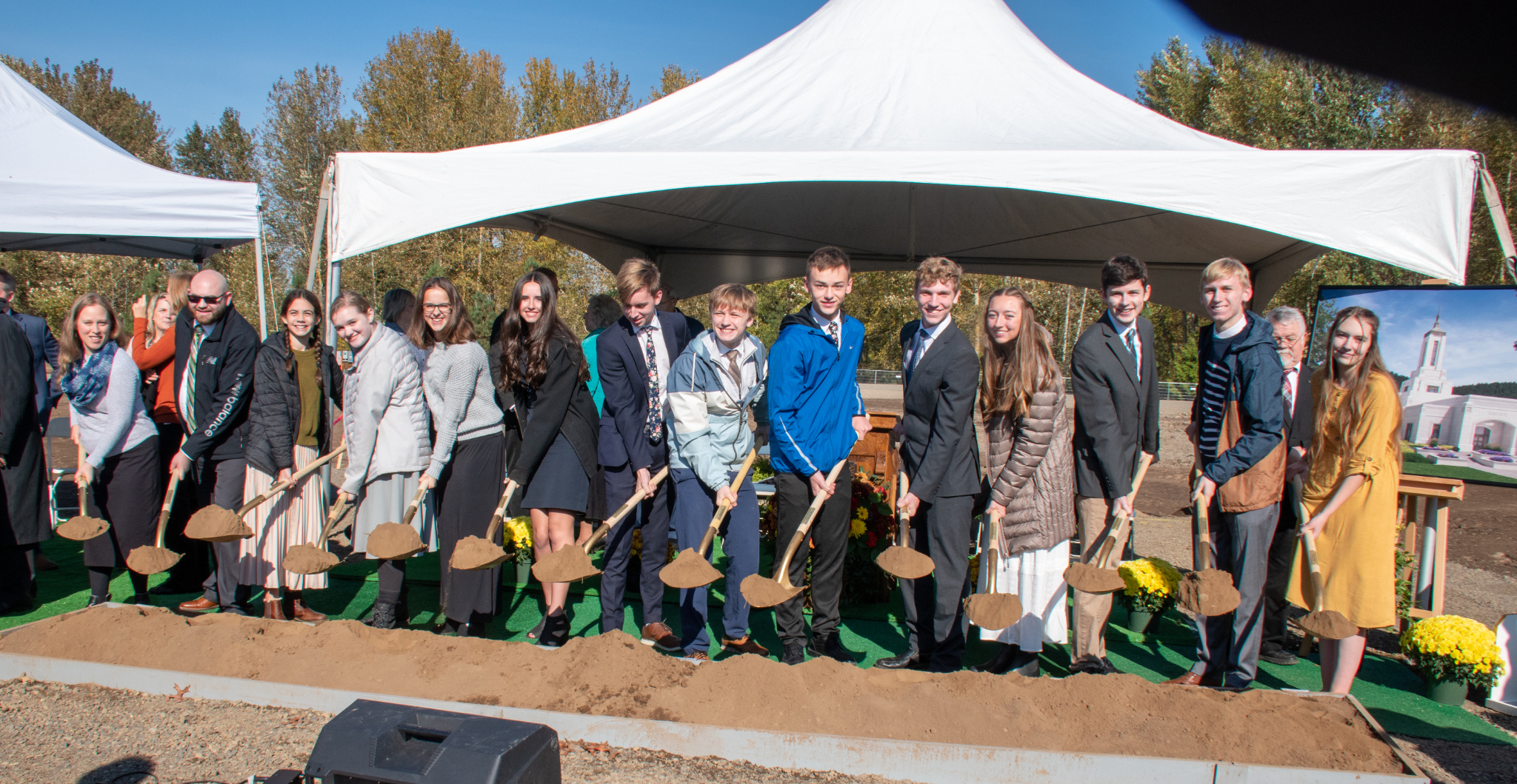 Invited guests, including Latter-day Saint youth from Oregon's Willamette Valley, turn the soil at the groundbreaking of the Willamette Valley Oregon Temple in Springfield, Oregon, on Saturday, October 29, 2022. 2022 by Intellectual Reserve, Inc. All rights reserved.October 17, 2022