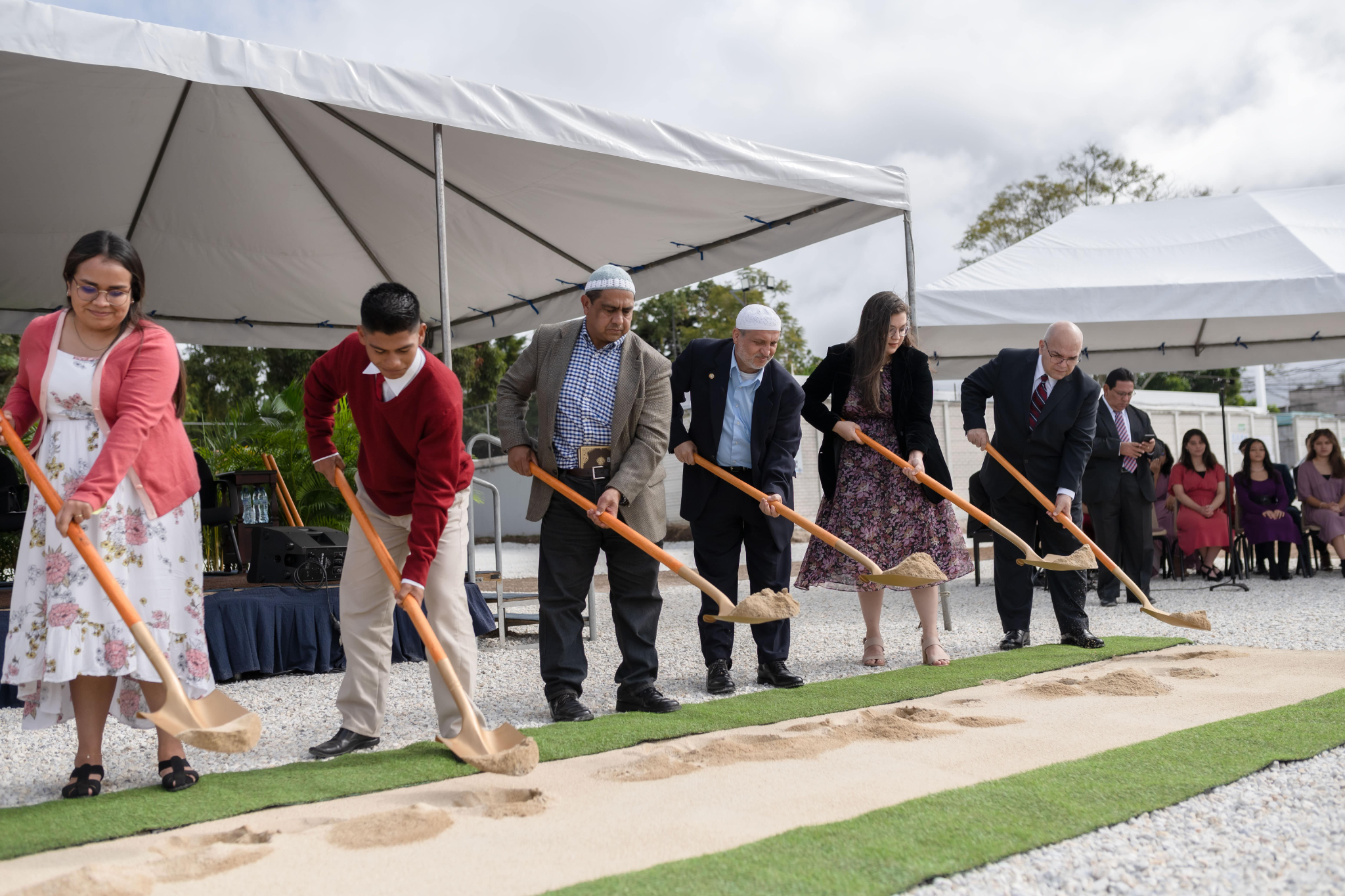 Invited guests ceremonially turn the dirt at the groundbreaking ceremony for the Miraflores Guatemala City Guatemala Temple on Saturday, December 3, 2022.2022 by Intellectual Reserve, Inc. All rights reserved.November 28