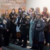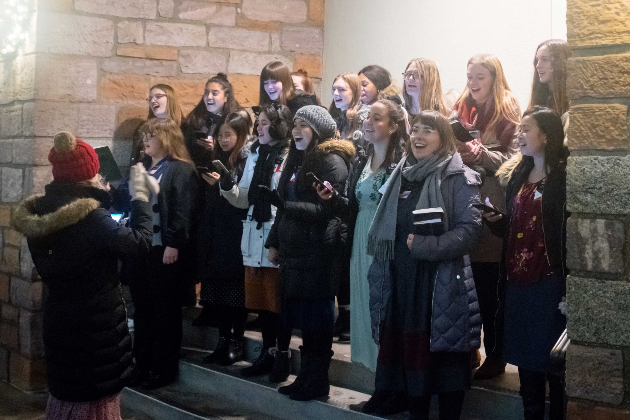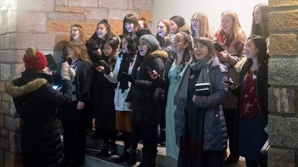 Sister missionaries spread the music of Christmas. Their melodic voices add to the festive mood at historic Temple Square.