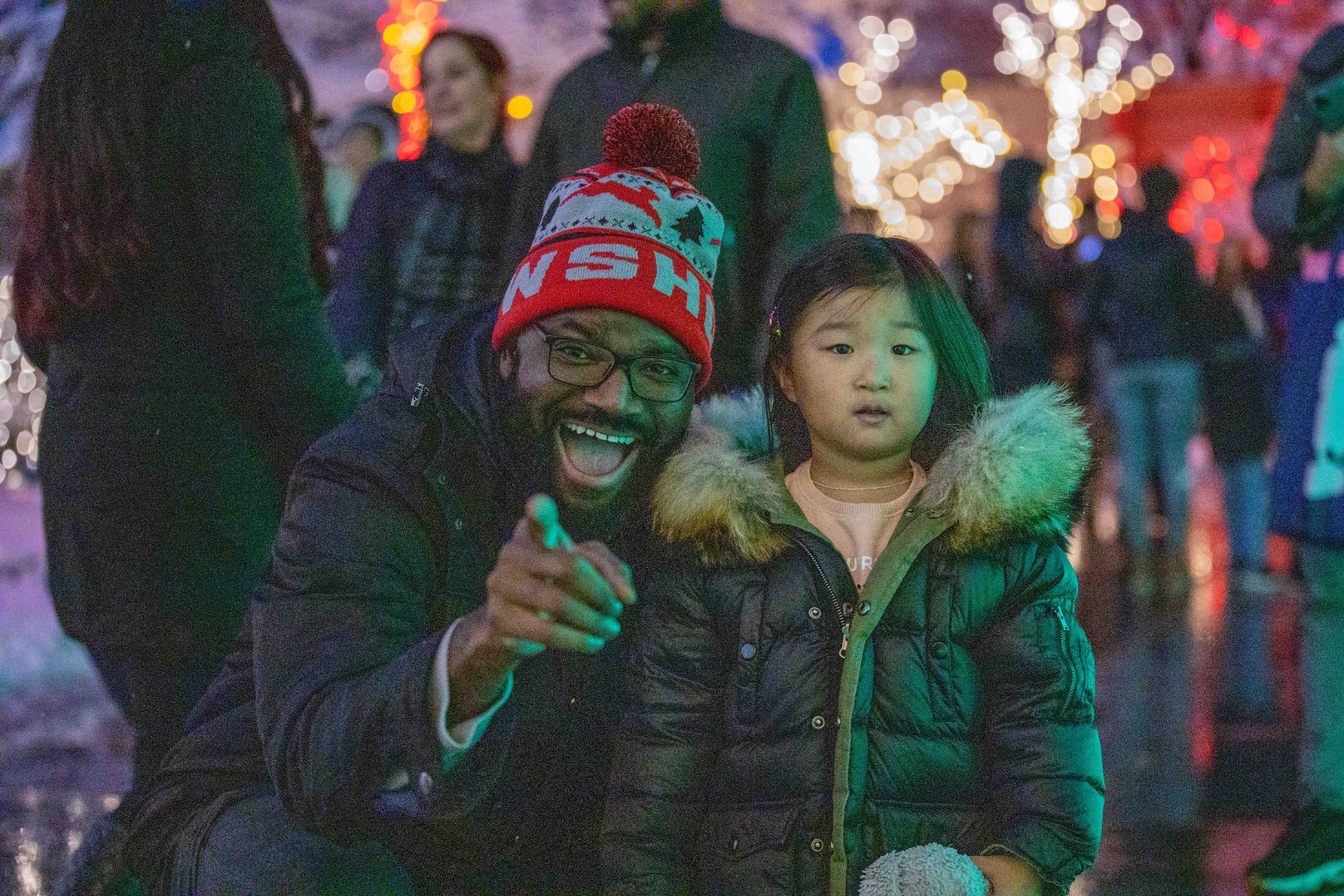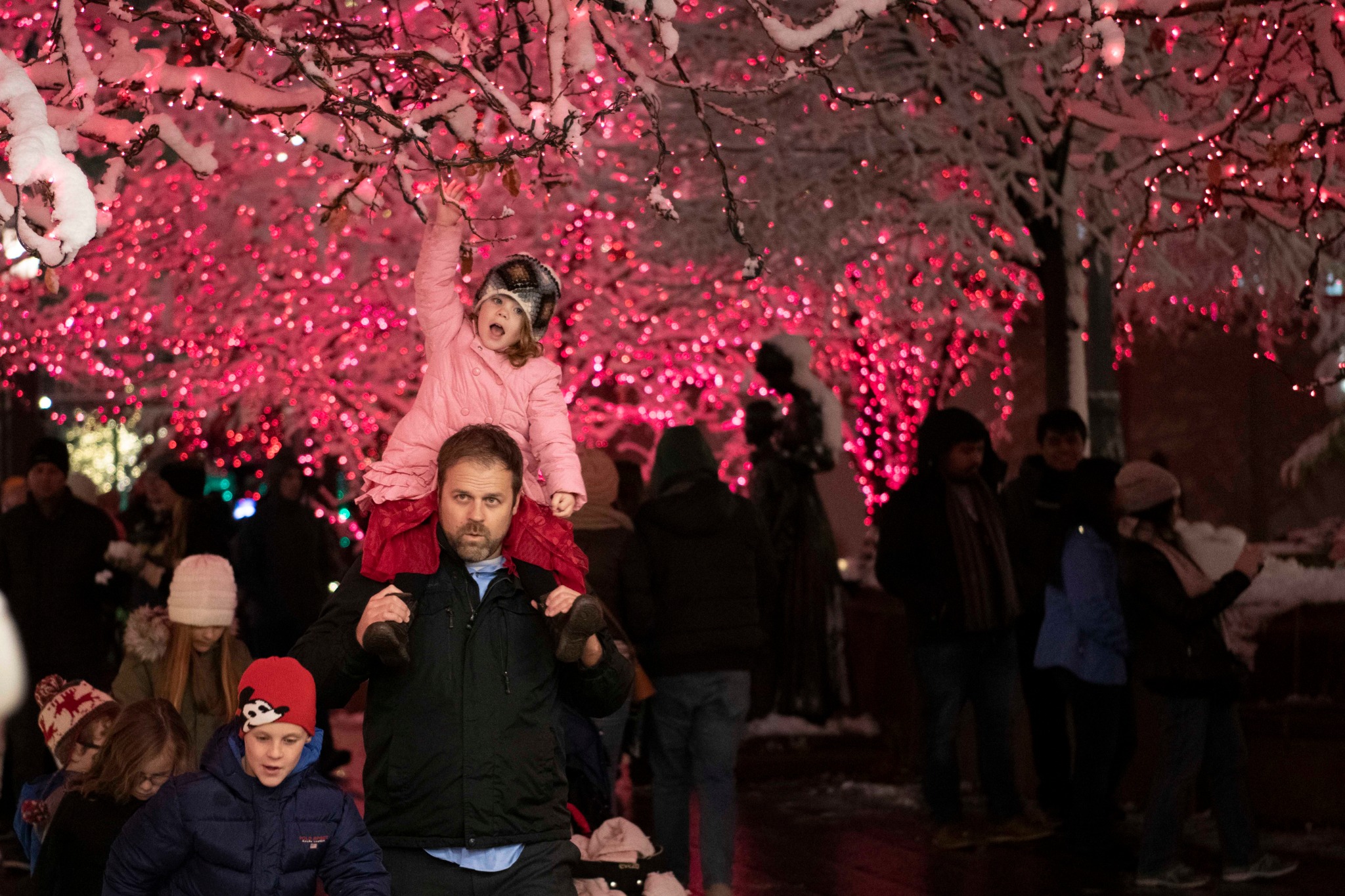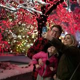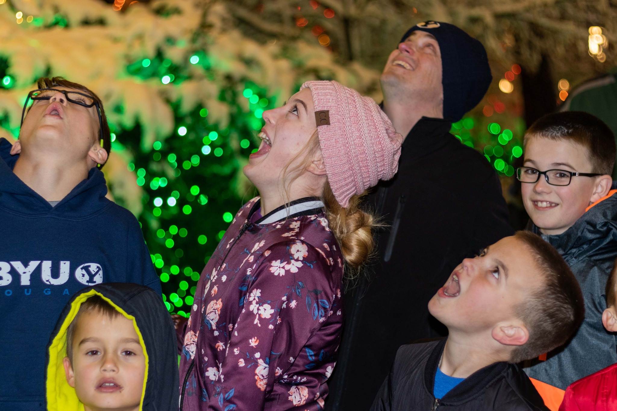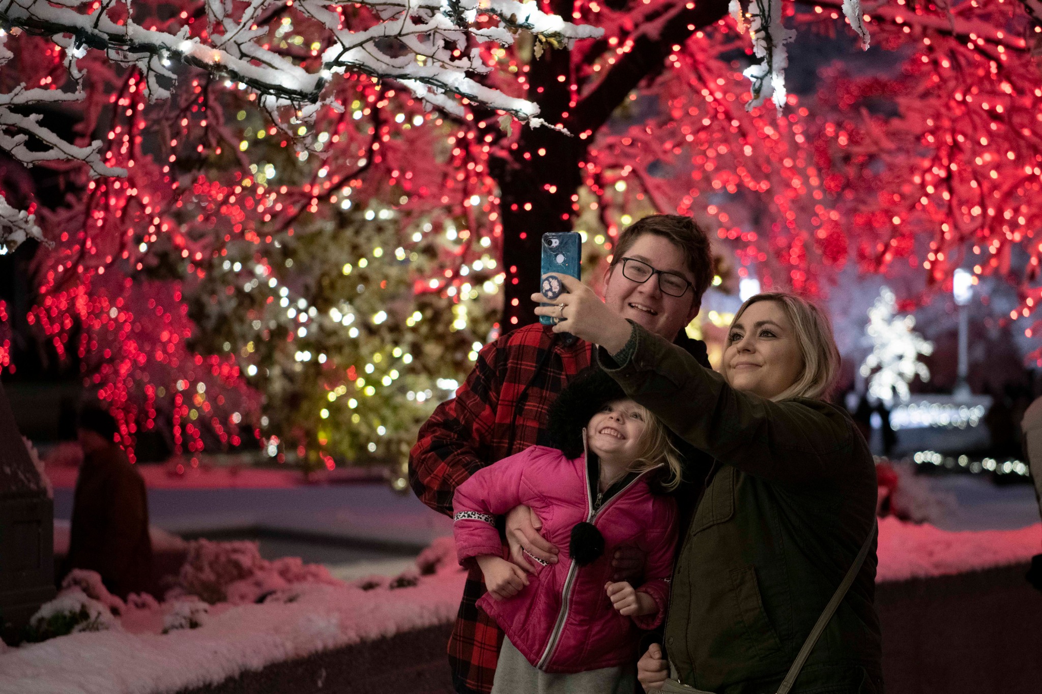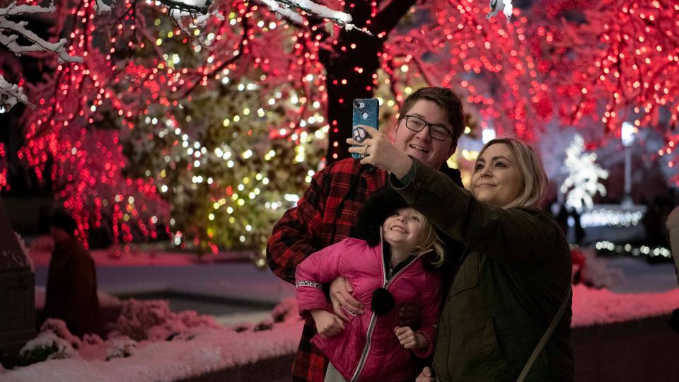 Visitors show their excitement when the Christmas lights are turned on at Temple Square.