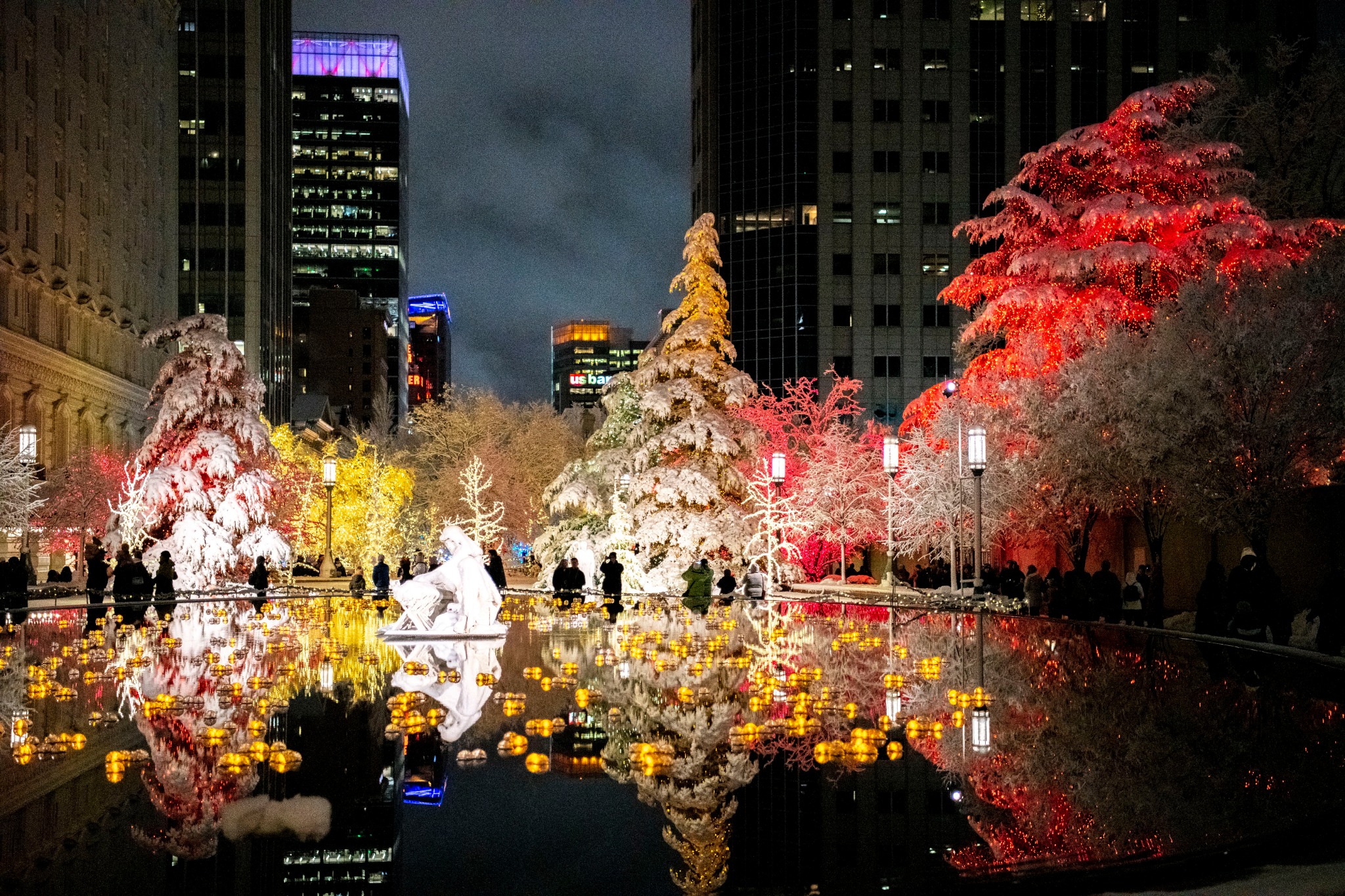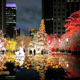 The reflecting pond, located between the Salt Lake Temple and the Joseph Smith Memorial Building, mirrors the beautiful Christmas lights.