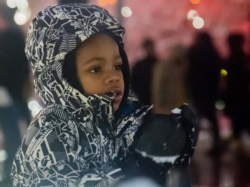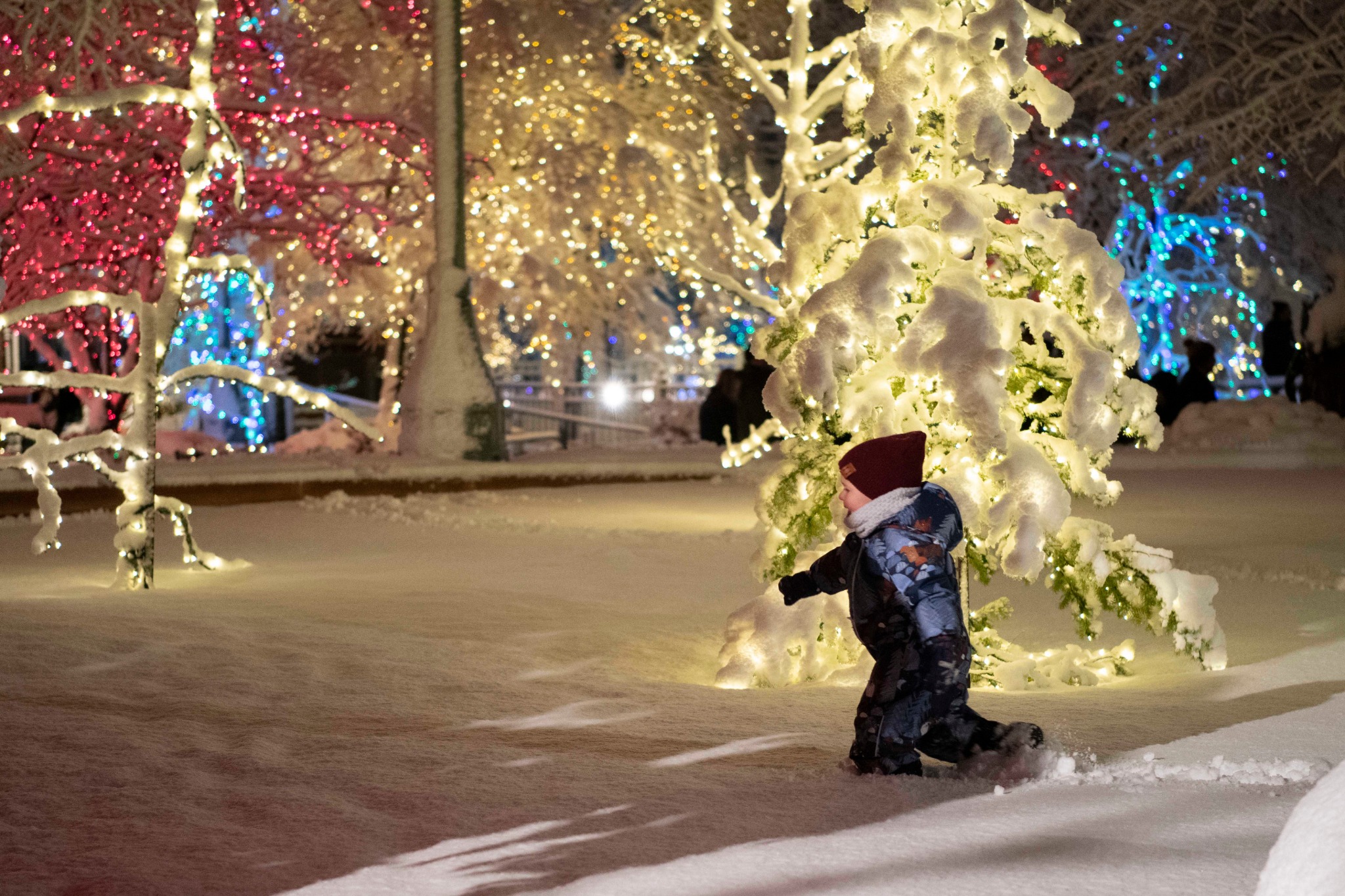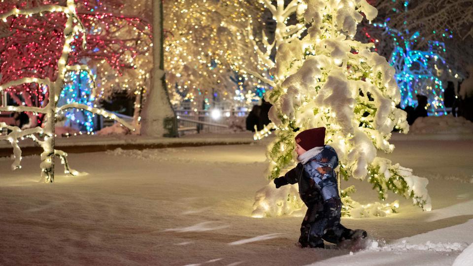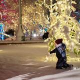 A young boy seems to be more taken with the deep snow on historic Temple Square than the Christmas lights around him. The lighting takes place the day after Thanksgiving.
