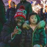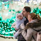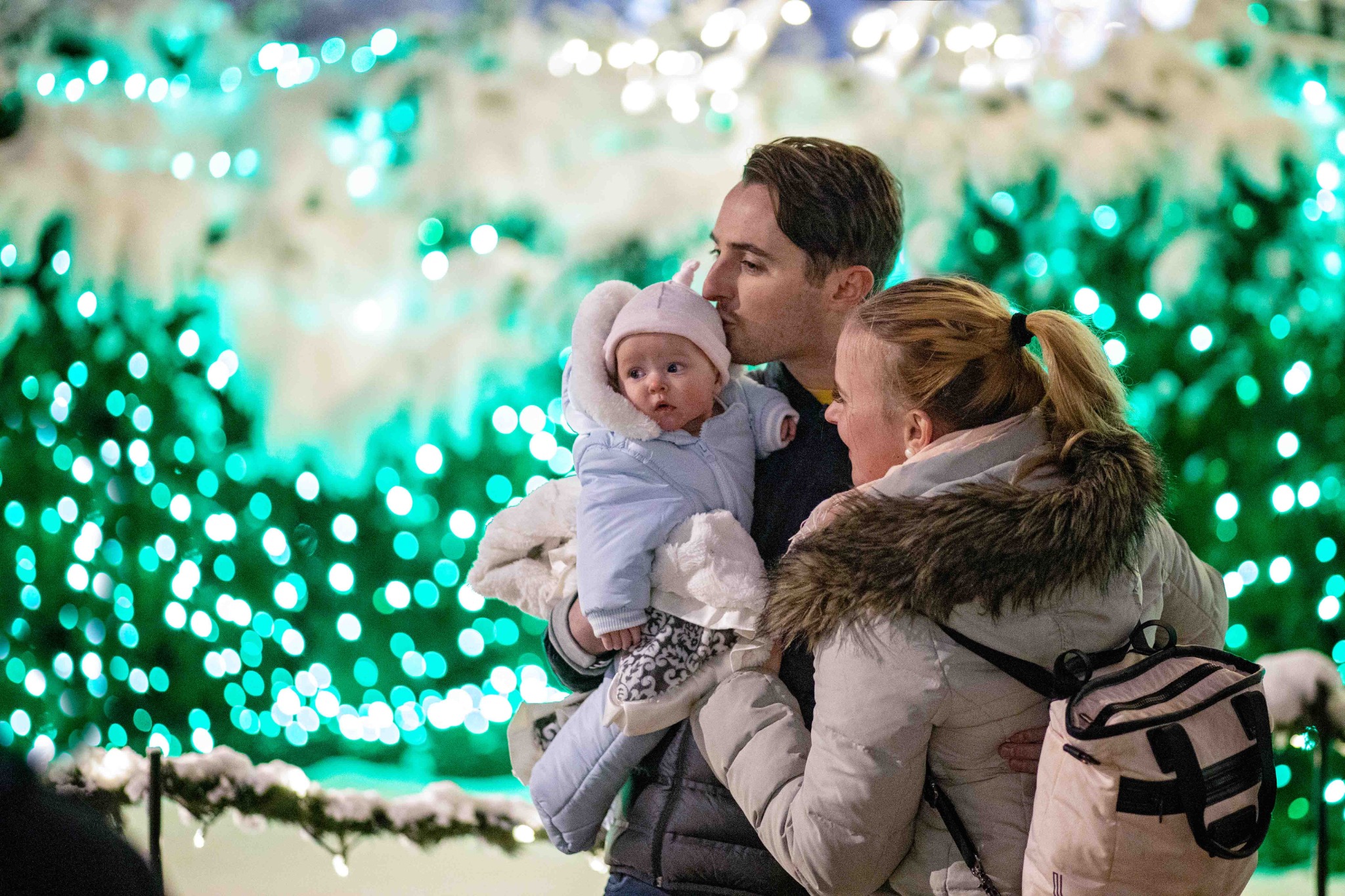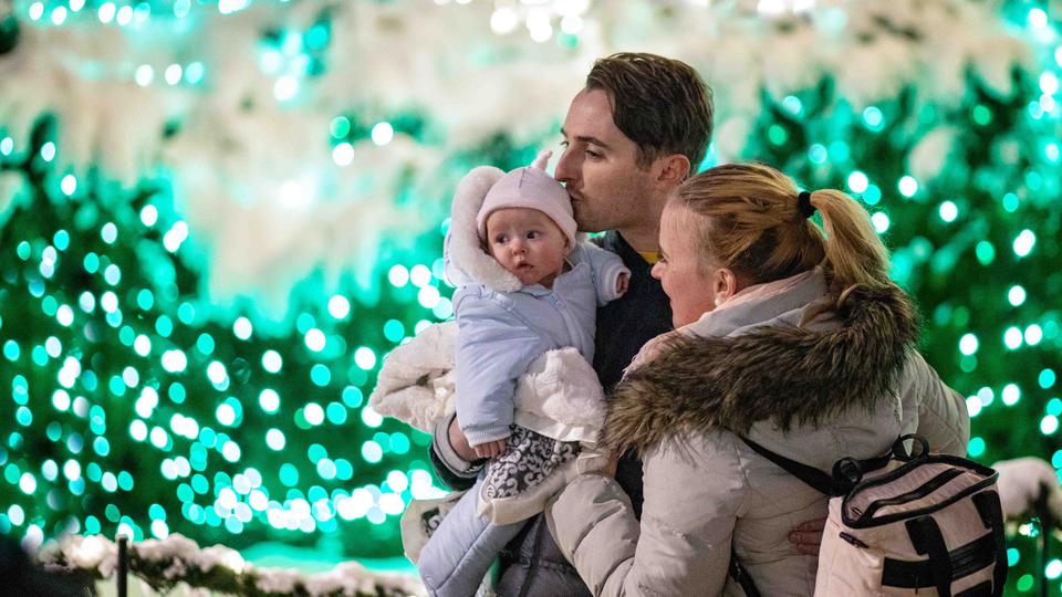An infant gets her first look of the colorful Christmas lights with mom and dad at Temple Square.