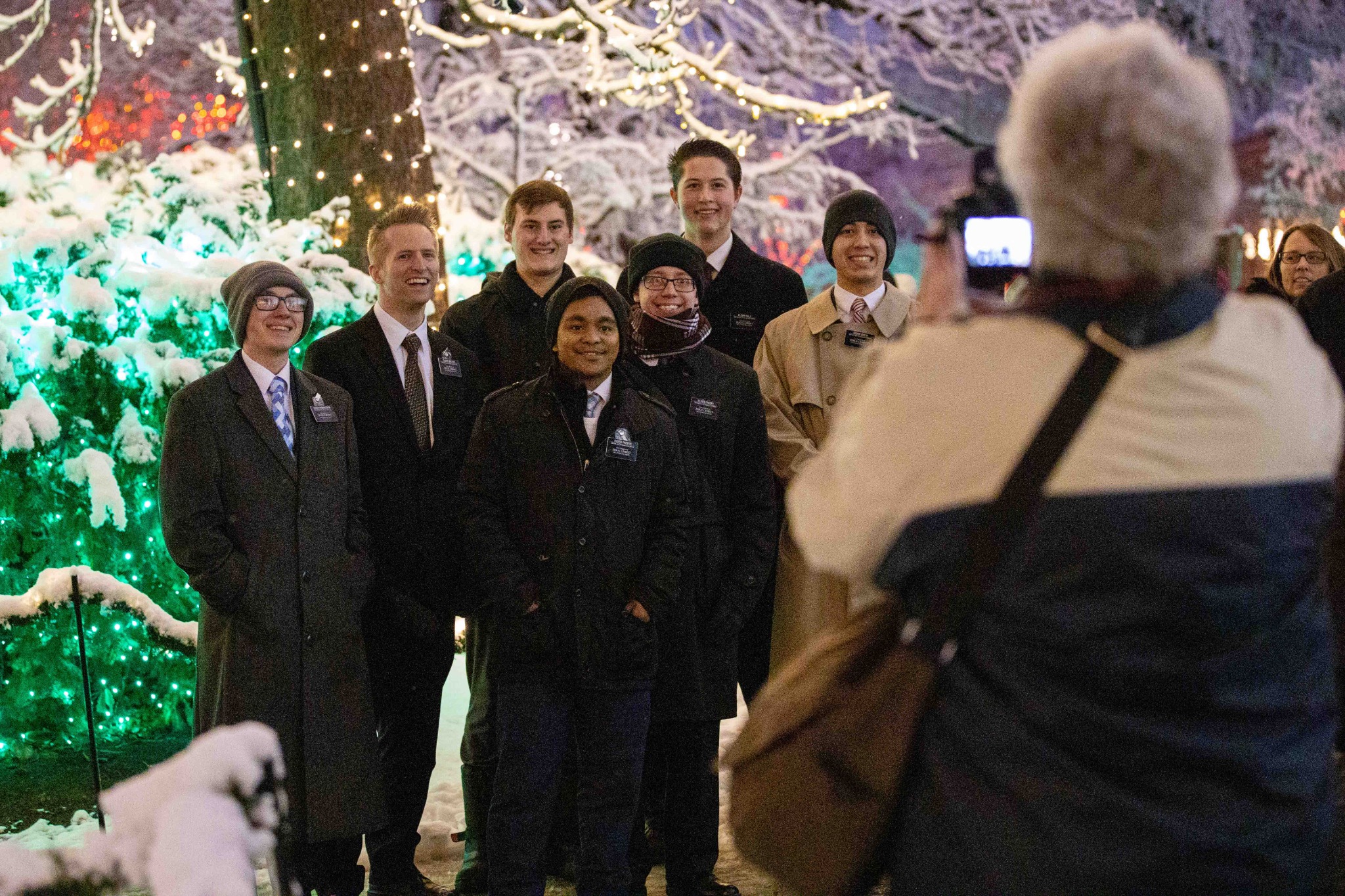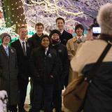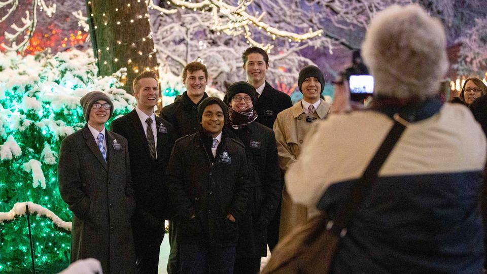 Missionaries of The Church of Jesus Christ of Latter-day Saints pose for a Temple Square visitor during the Christmas lighting on Temple Square.