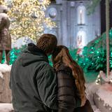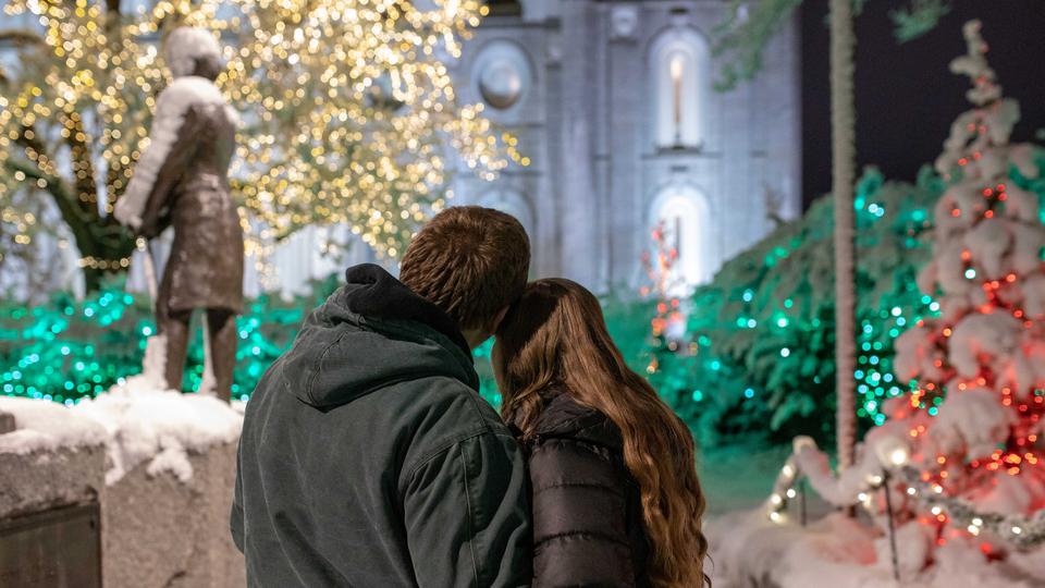 A couple reflects on the Salt Lake Temple in the midst of the Christmas lights.