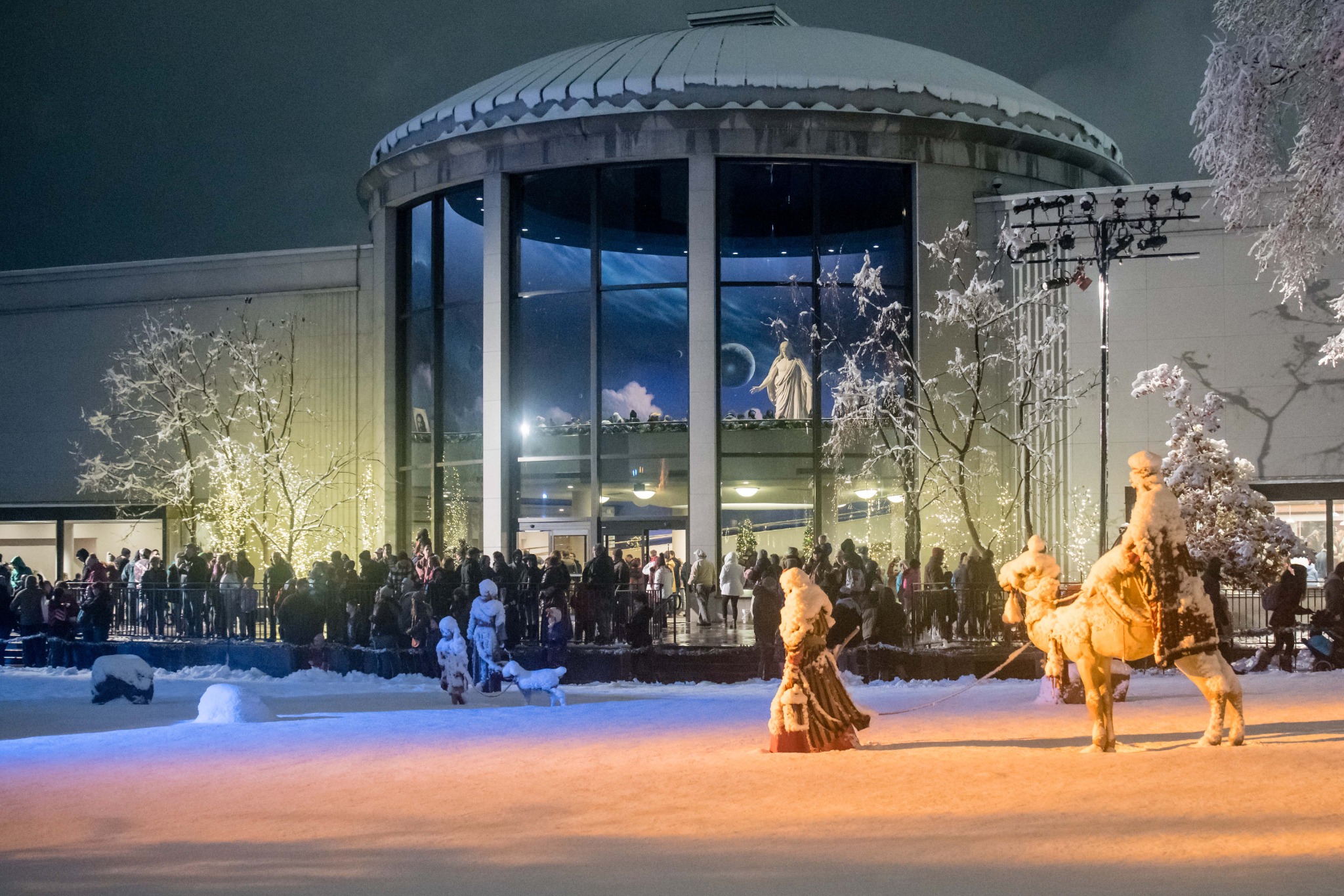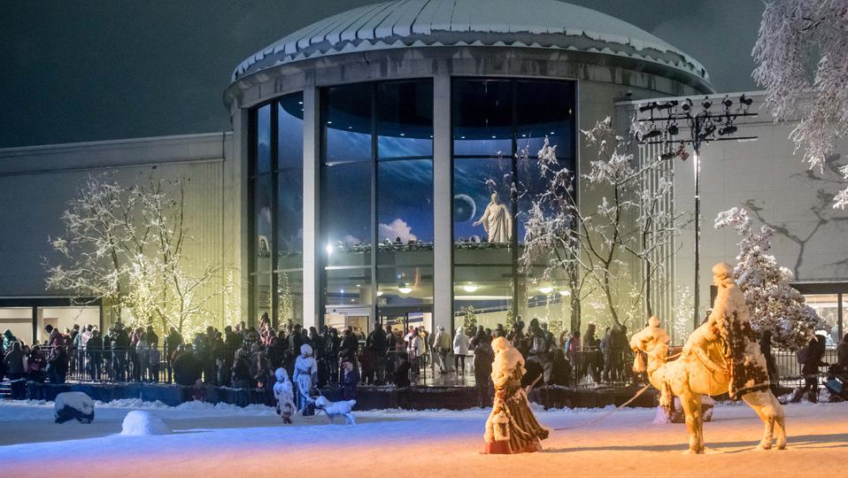 The Christus statue in the North Visitors’ Center overlooks the life-size nativity. The story of the birth of Jesus Christ, in the Bible’s second chapter of Luke, is read by Church President Russell M. Nelson.
