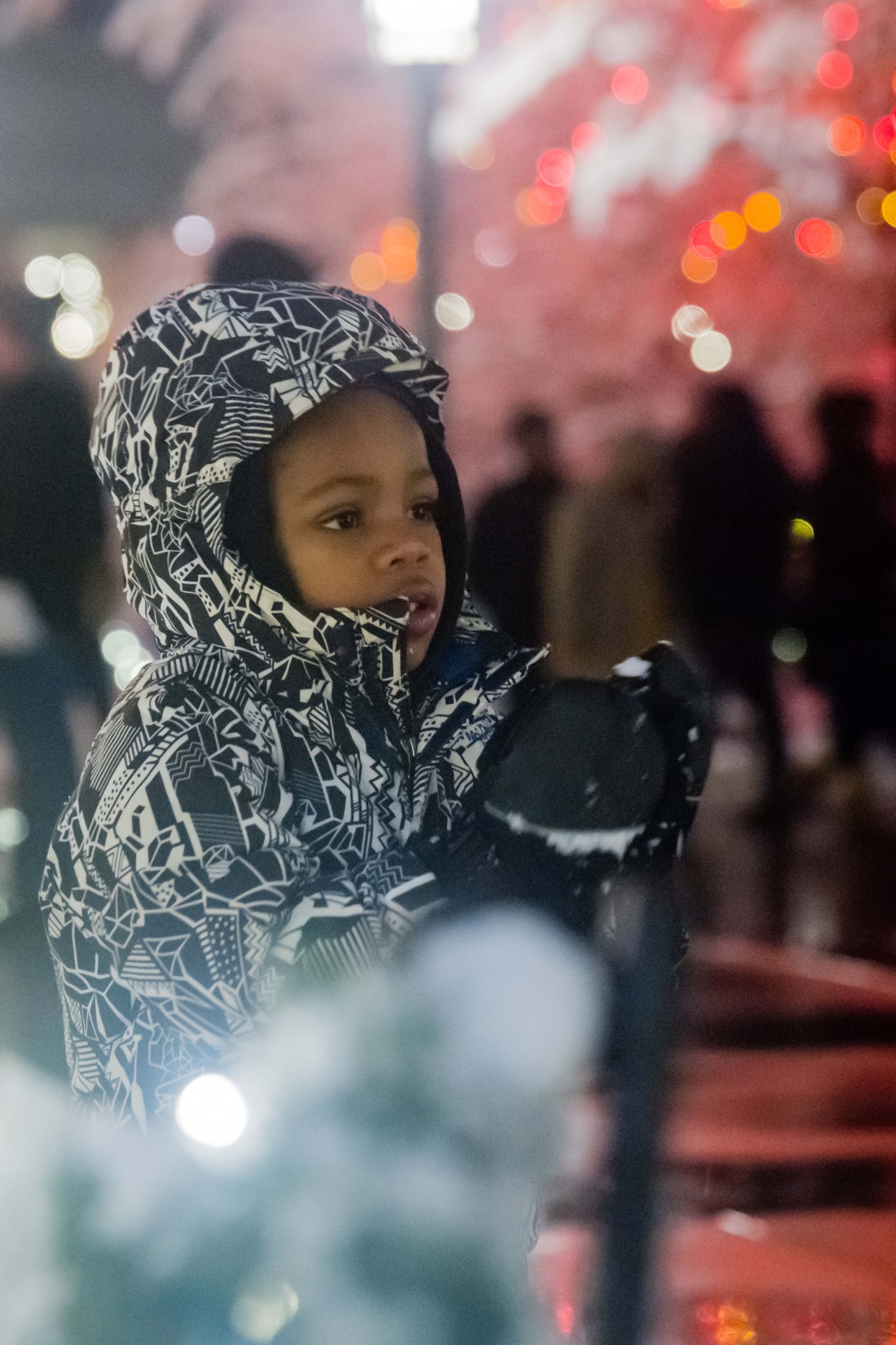 A boy is fascinated by the Christmas lights at Temple Square.