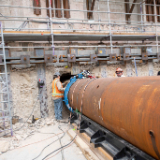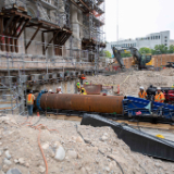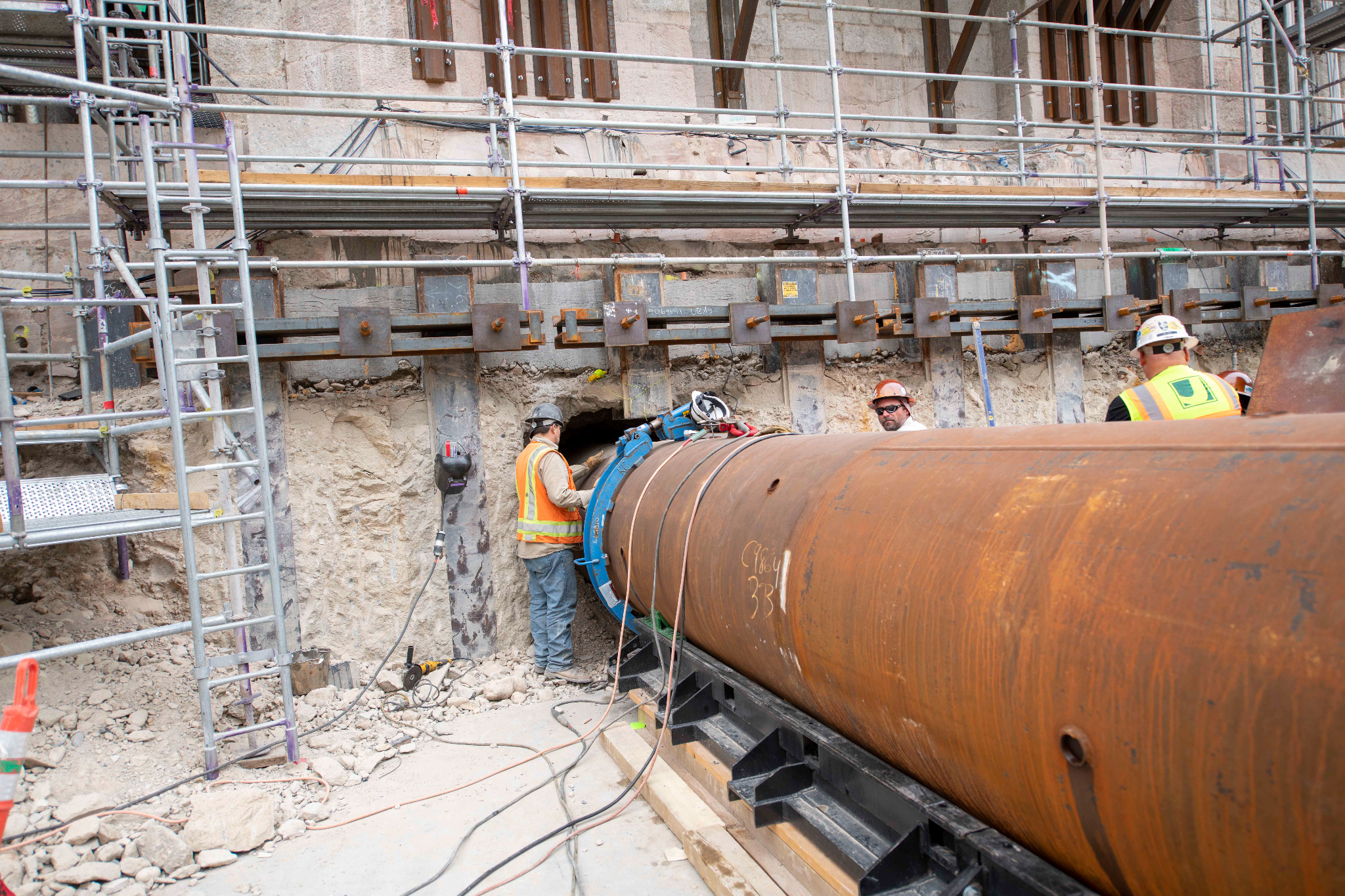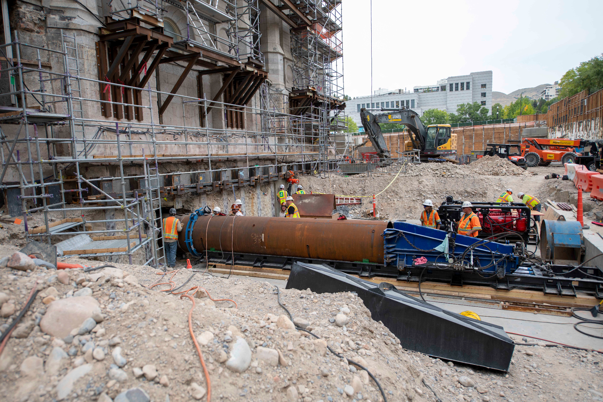 Over the past month, the Salt Lake Temple has begun “jack and bore,” a major seismic strengthening process in which steel pipes, 3.5 to 4 feet in diameter, are inserted below its existing foundations. The soil is removed from inside the pipe as it is gradually inserted horizontally. Each pipe under the temple towers is 40 feet long, made from two 20-foot-long segments welded together. The soil inside the pipes will initially be removed by hand to ensure the pipes are precisely installed. The gap between the outside surface of the pipe and the surrounding soil is then filled with grout. After the pipes are installed, they will be filled with reinforced steel, including post-tensioning strands, and high-strength concrete. The entire existing foundation of the temple will be supported by 92 such pipes.