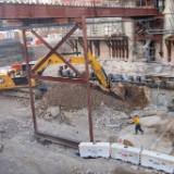 As the excavation on the north side of the temple nears completion, excavation on other sides of the temple will continue as workers prepare for further stabilization work. This picture is taken in front of the east towers of the temple. The excavation is in preparation for a concrete pad. The stable surface will support the heavy equipment used in the jack and bore process.