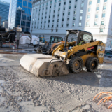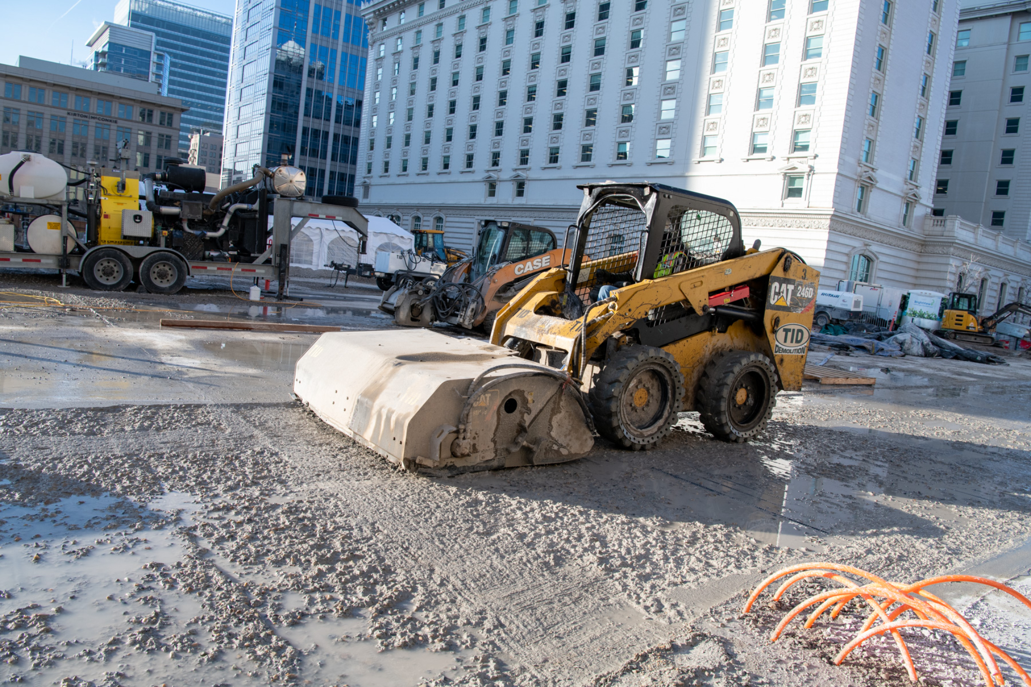 A large rotating brush attached to the “broom” machine cleans debris from the surface of the Church Office Building plaza so that it can be repaired with new concrete, Salt Lake City, Utah, January 2022. © 2022 by Intellectual Reserve, Inc. All rights reserved.The surface is also being filled with soil and tamped down to provide a stable and even surface for future paved areas.